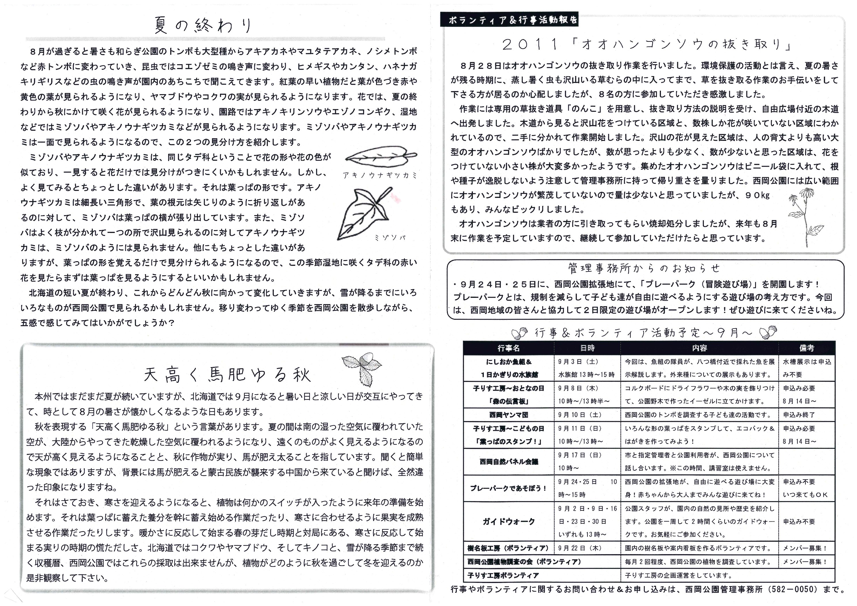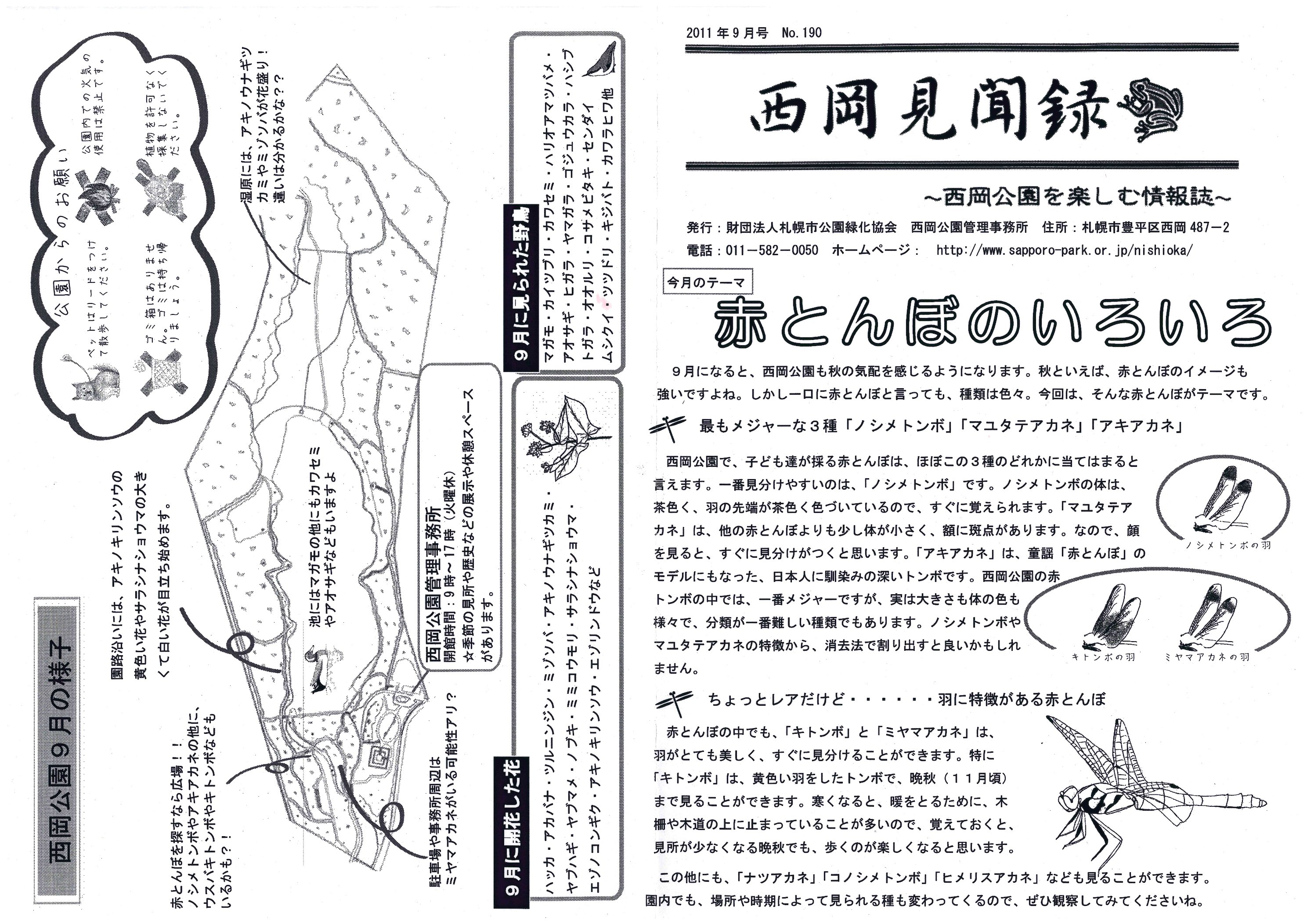 トンボ天国である西岡公園ではこの時期になると赤とんぼが多く見られるようになります。そんな赤とんぼでもっとも多く見られる3種類の「ノシメトンボ」「マユタテアカネ」「アキアカネ」について見聞録では書かれています。内側では夏の終わりから咲きはじめる「ミゾソバ」と「アキノウナギツカミ」について、8月に行った「オオハンゴンソウの抜き取り」のレポートとなっています。