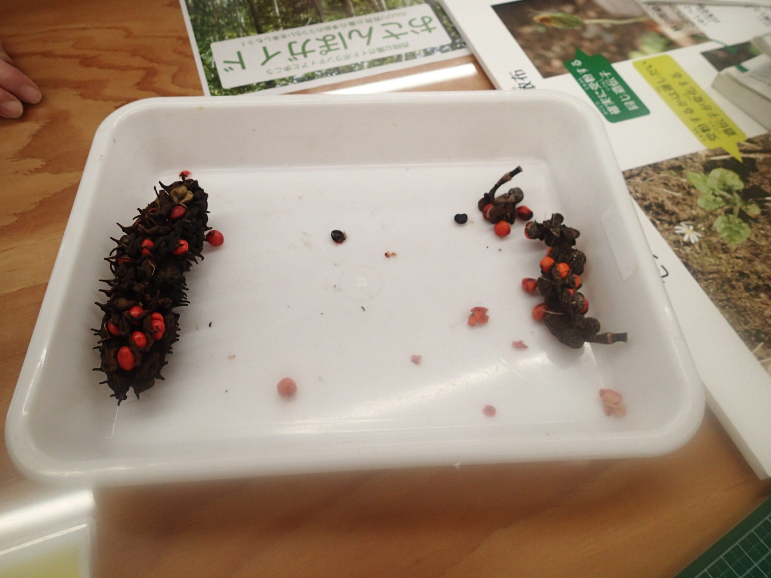 出発前に管理事務所でキタコブシとホオノキの果実を観察しました。