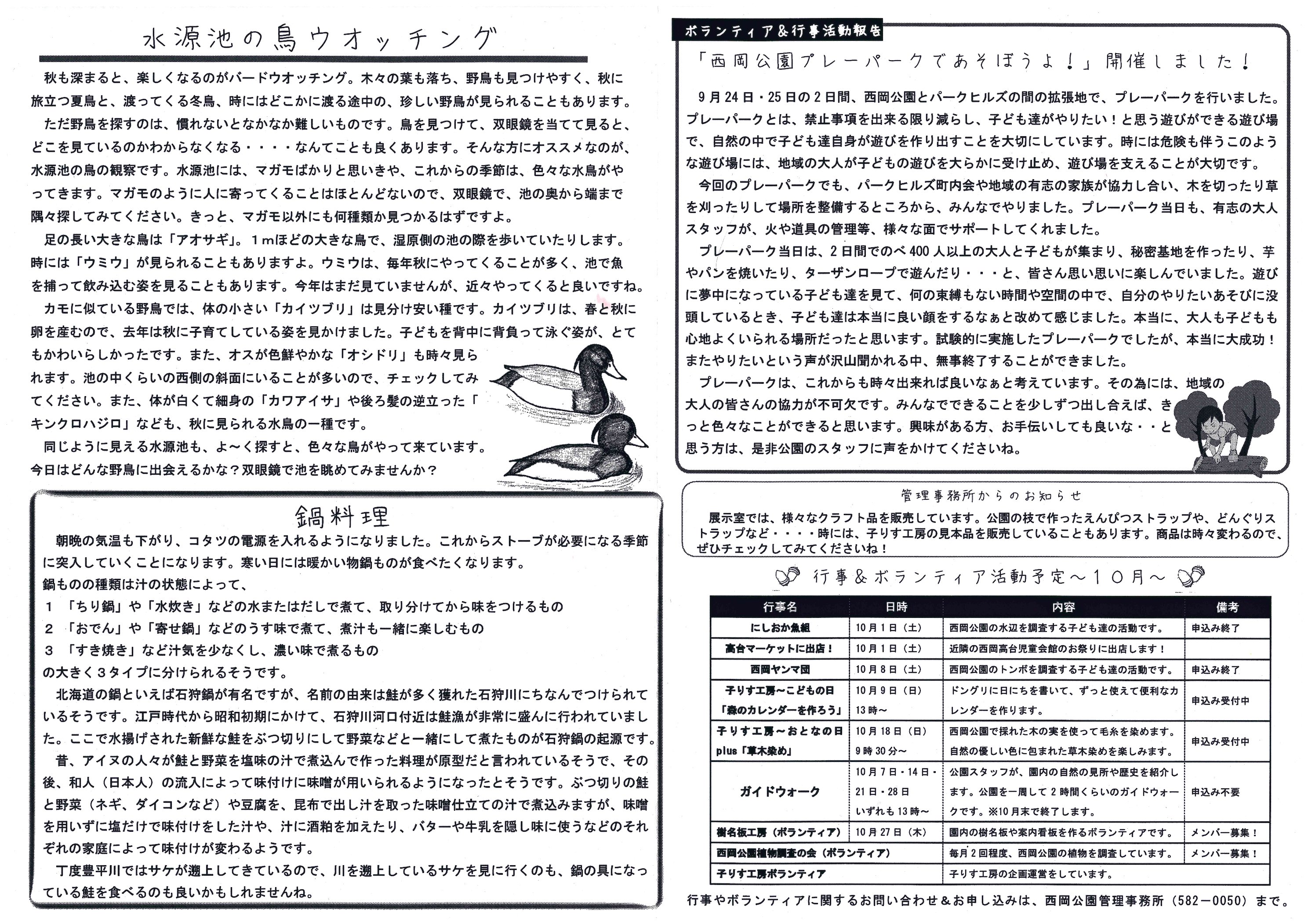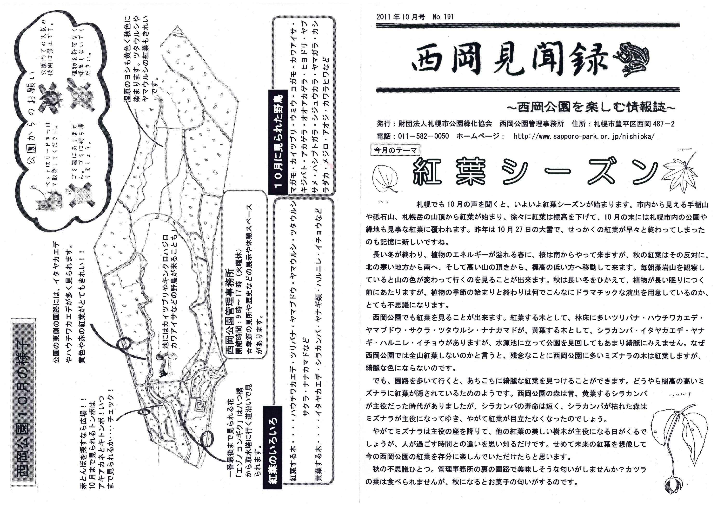 10月は紅葉シーズンです。あちこちで紅葉が始まり、西岡公園でもヤマブドウやサクラなどの赤い葉やシラカバやイチョウなどの黄色の葉っぱが紅葉しているのが見られます。 今回の見聞録はそんな紅葉する葉っぱについてのお話となっています。内側では9月に行われたプレーパークのレポートや水源池で見られる鳥ウォッチングについてのお話となっています。
