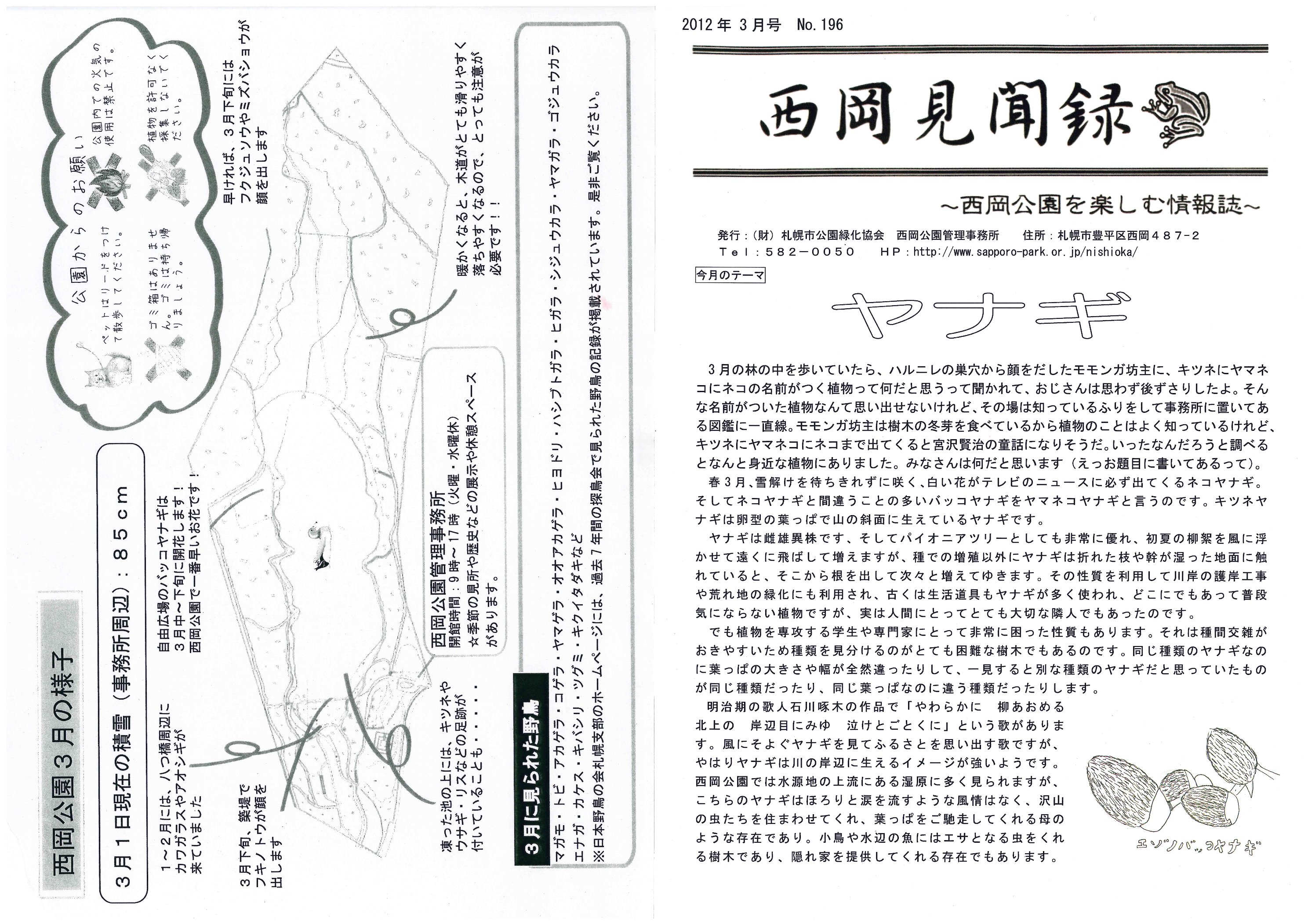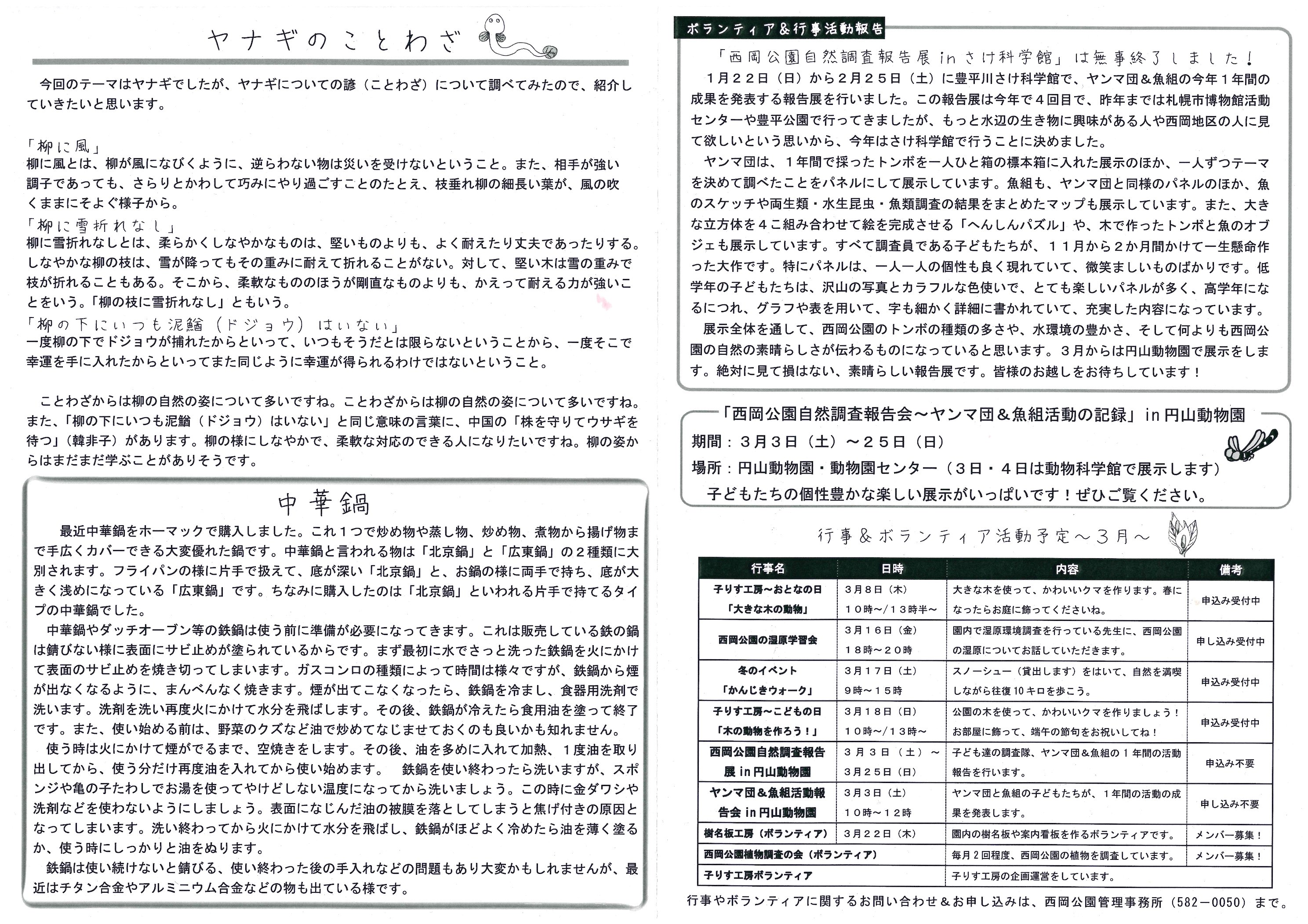 3月になると西岡公園の湿地では雪解け水の増水が少しずつ始まり、また、バッコヤナギの黄色い花が咲いてきて、春の訪れを感じることができます。今回の見聞録では湿地や川沿いで見られるヤナギについてです。内側ではヤナギにまつわることわざや、西岡公園で活躍するヤンマ団や魚組の活動報告会でのレポートとなっています。
