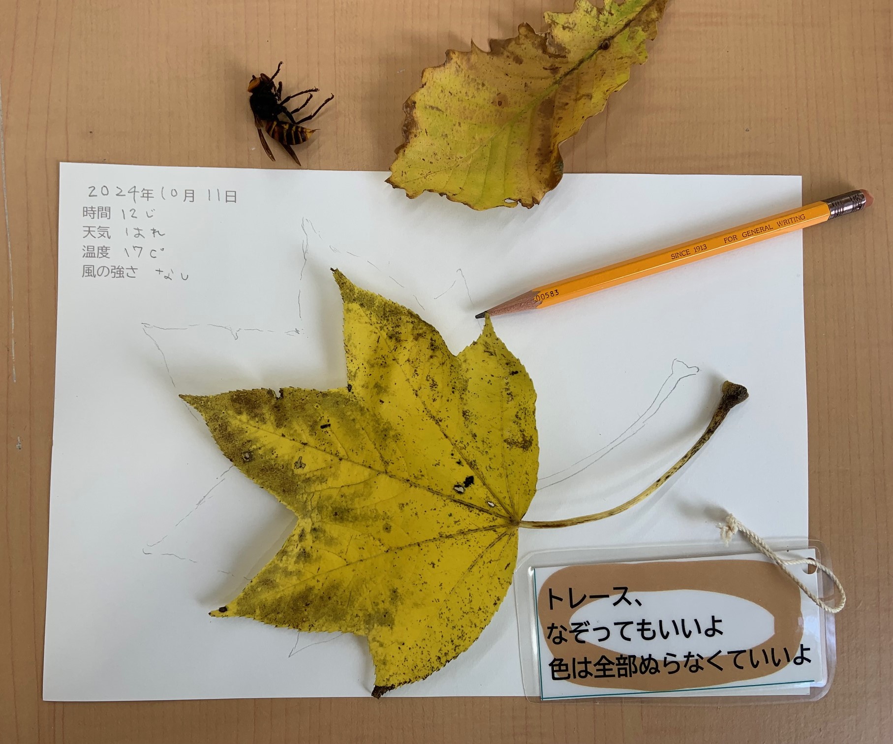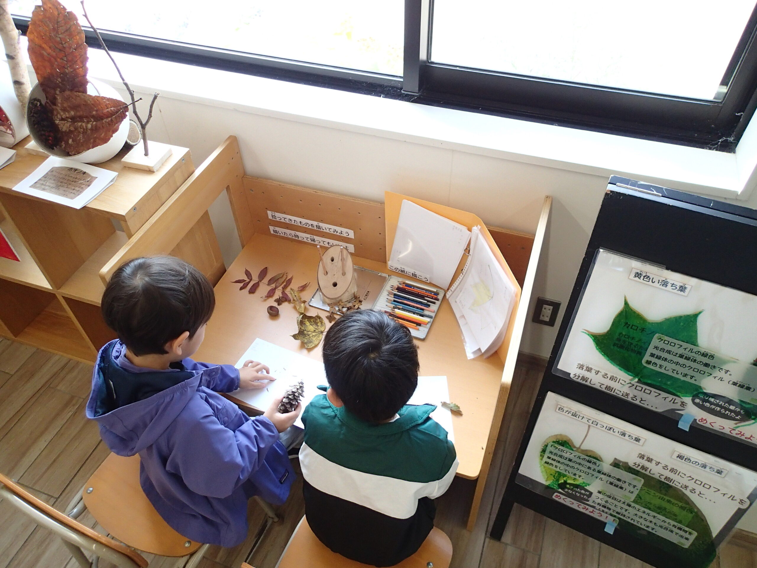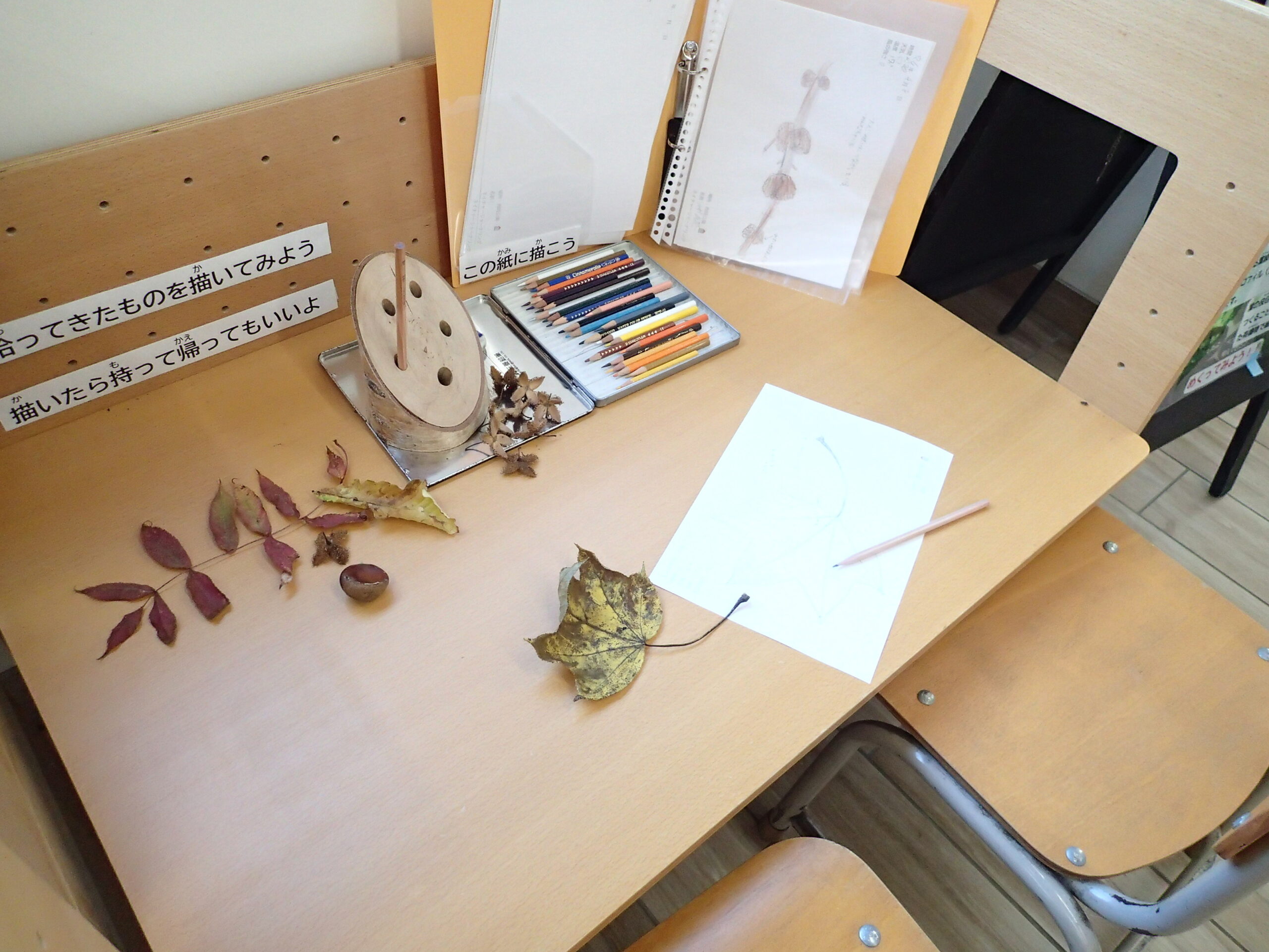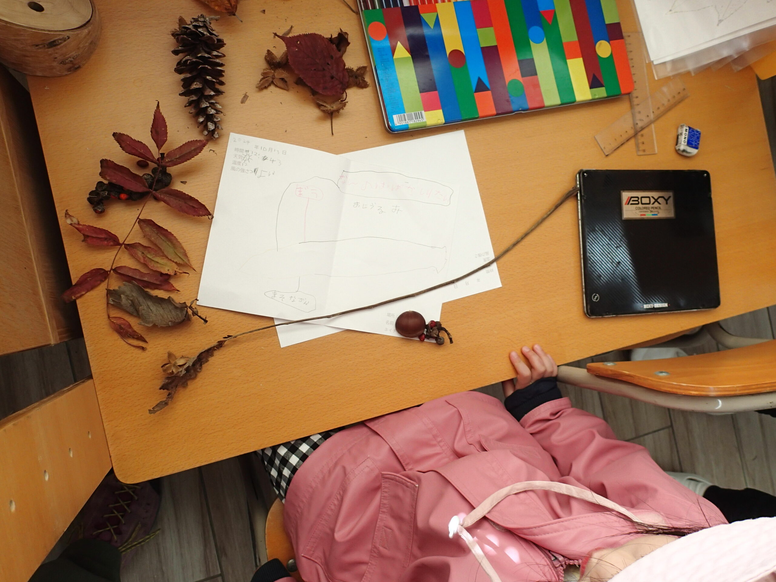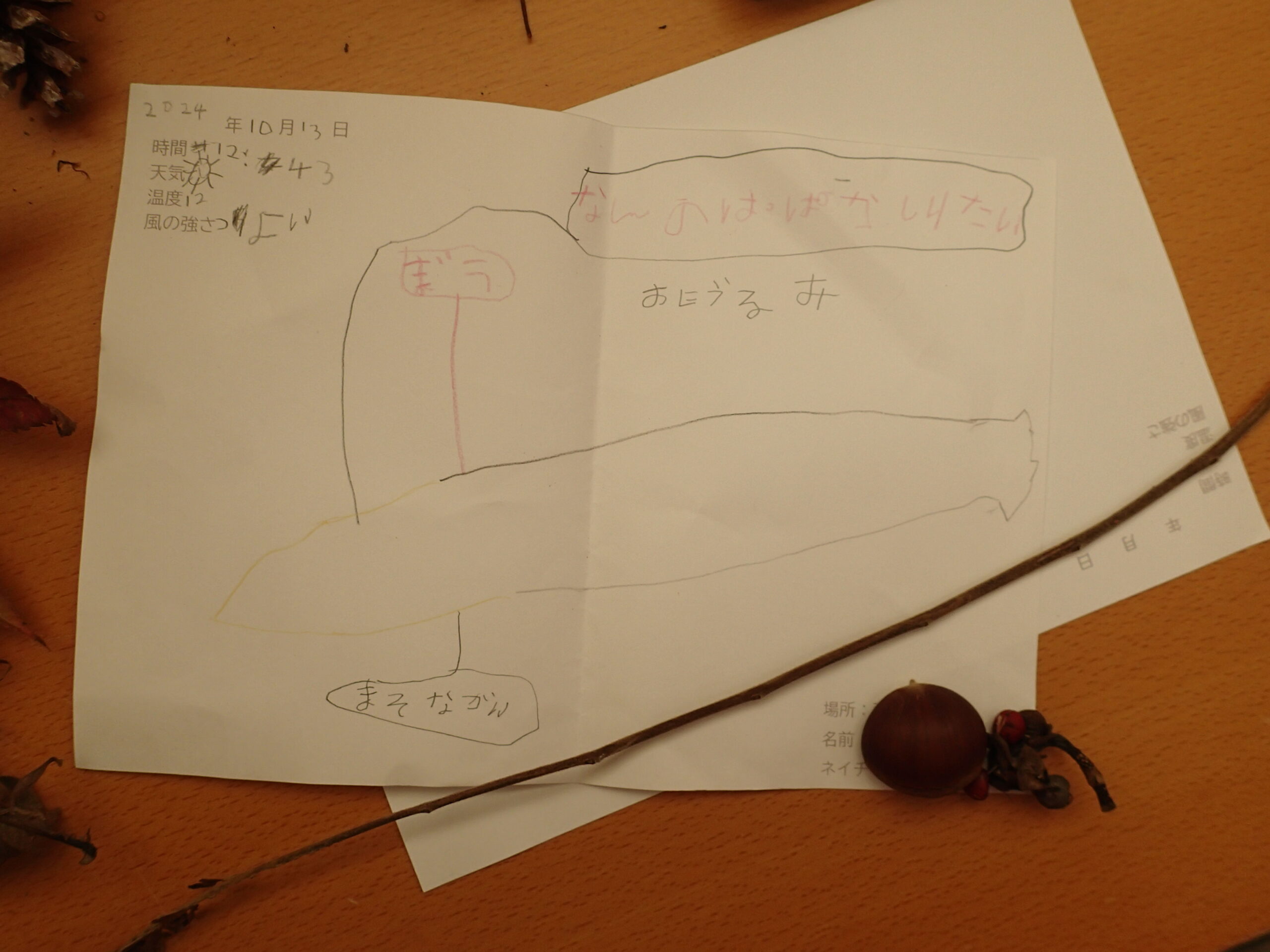 森の中で一緒に落ち葉やドングリや、虫、マツボックリを探して、それを描くのも楽しいですね。