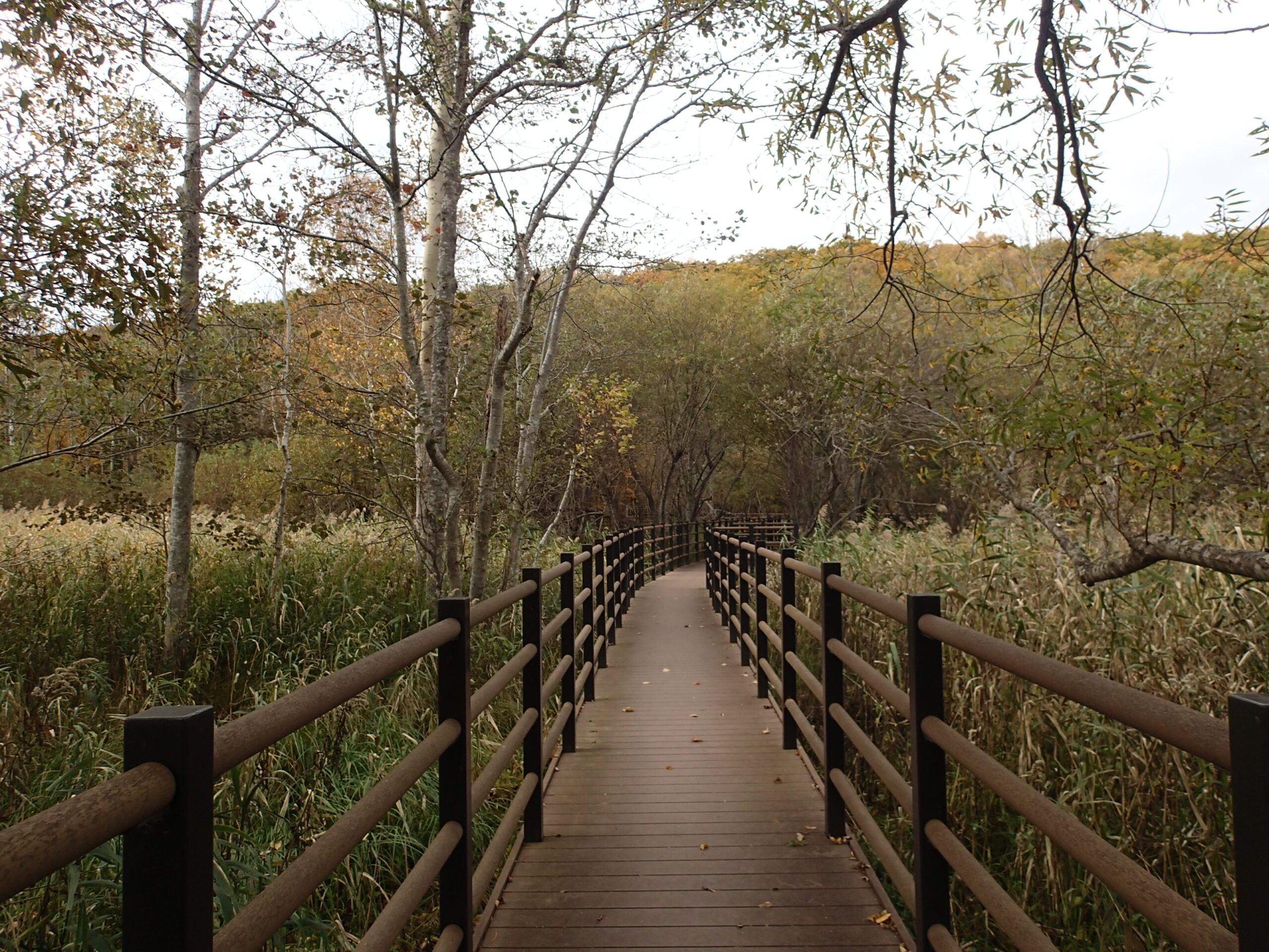 木道の周りに生えているヨシの穂がこれからだんだんフワフワになっていきますよ。