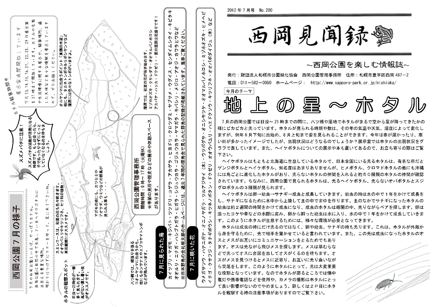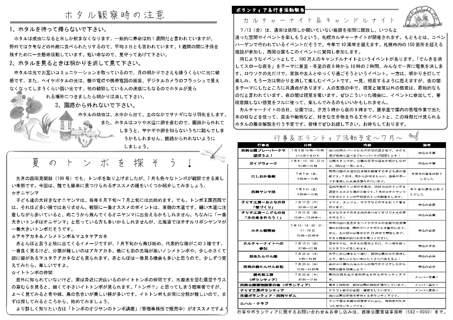 西岡公園では毎年7月になると、日没から21時にかけてヘイケボタルが飛びます。見聞録ではそんなヘイケボタルの生態について書かれています。また、内側ではホタルを観察するときの注意事項や、これから出てくるトンボについて書かれています。