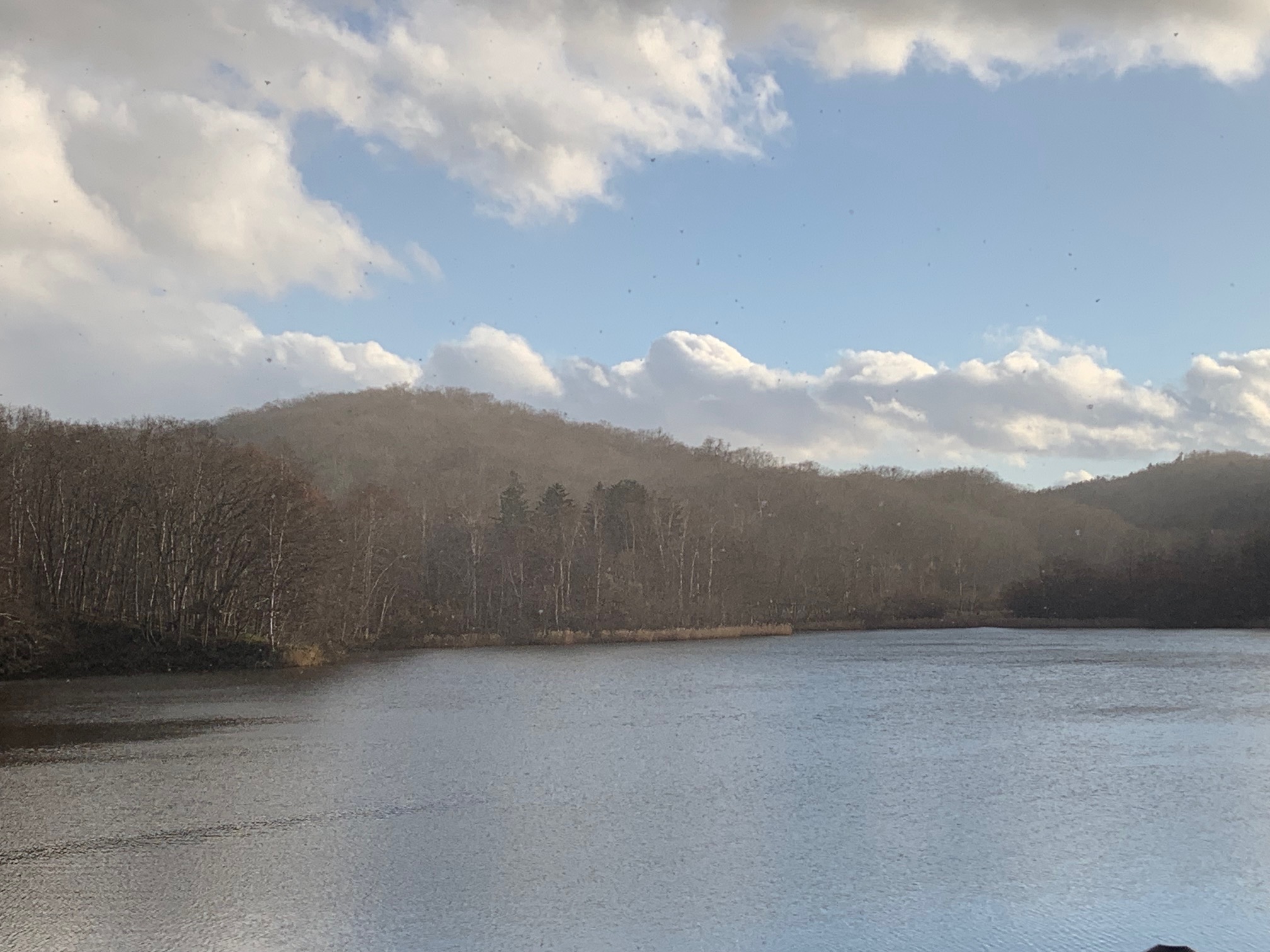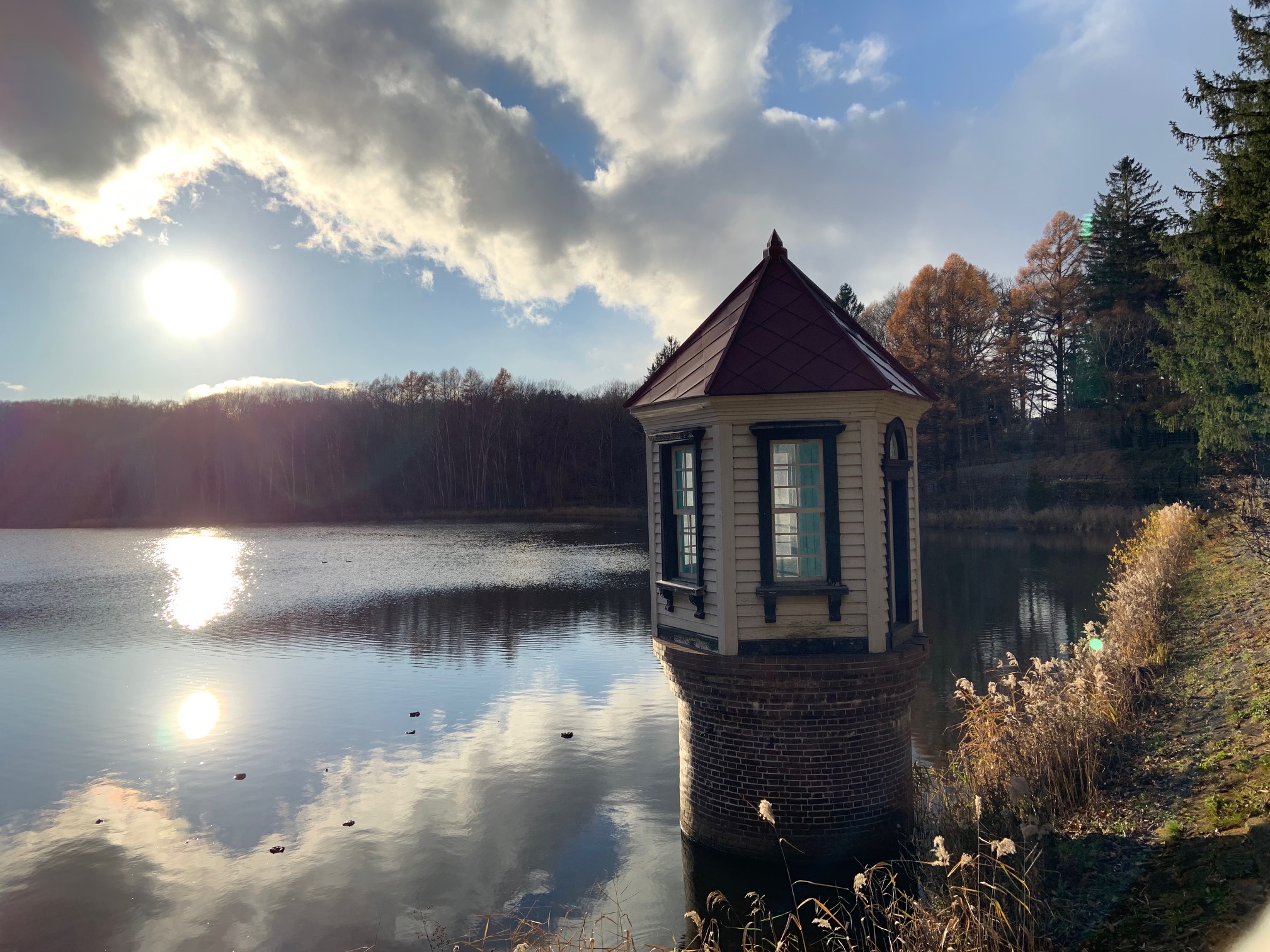 取水塔のある池は、風が止んだ瞬間、低くなった太陽と雲が映りました。