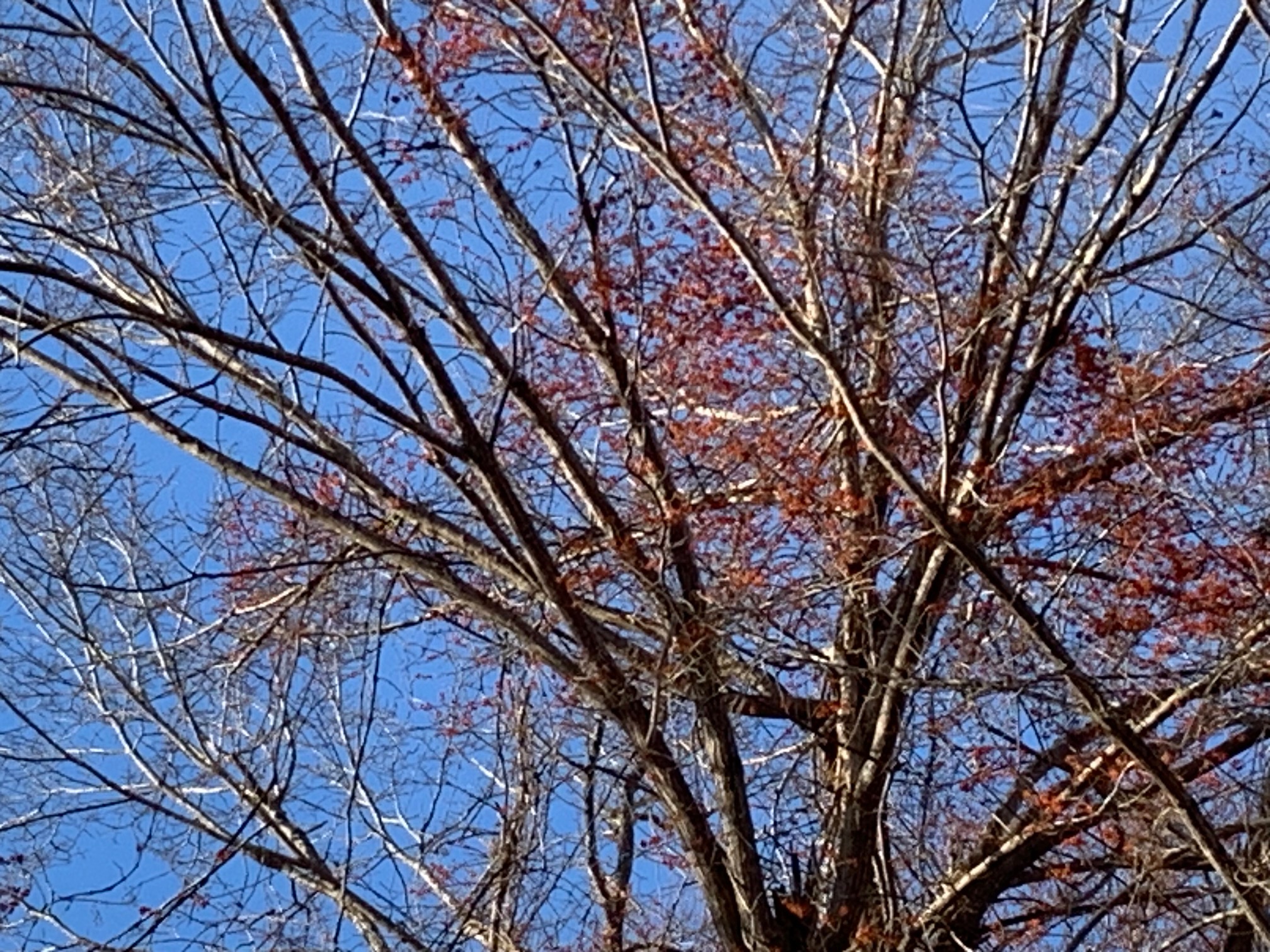 ハルニレに絡みついたツルウメモドキの果実の赤が遠くからも分かります。