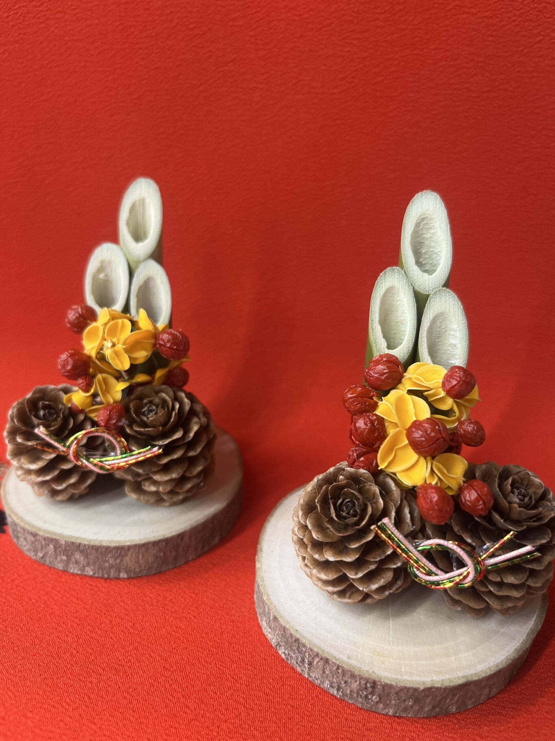 唐松(カラマツ)の松ぼっくり、根まがり竹(チシマザサ)、蔓梅擬(ツルウメモドキ)の果実で作っています!
