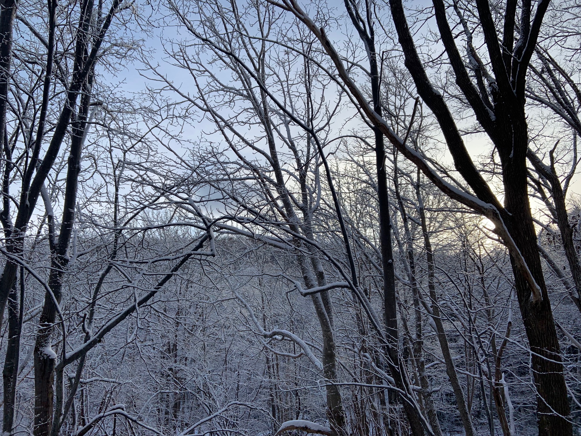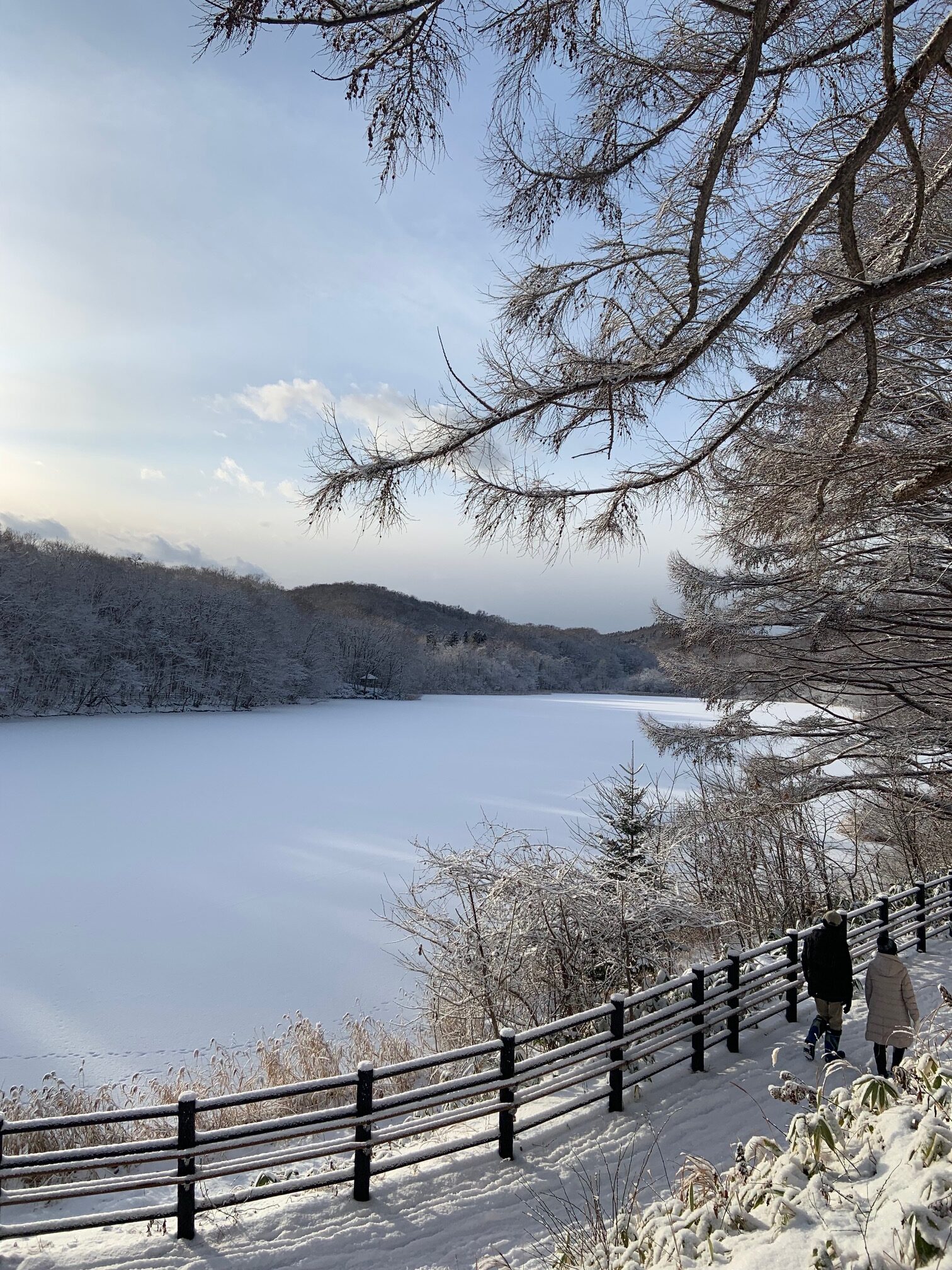 今朝の西岡公園は晴れ間が広がり昨夜の雪が森や凍った雪を包み込んで、幻想的な朝でした。