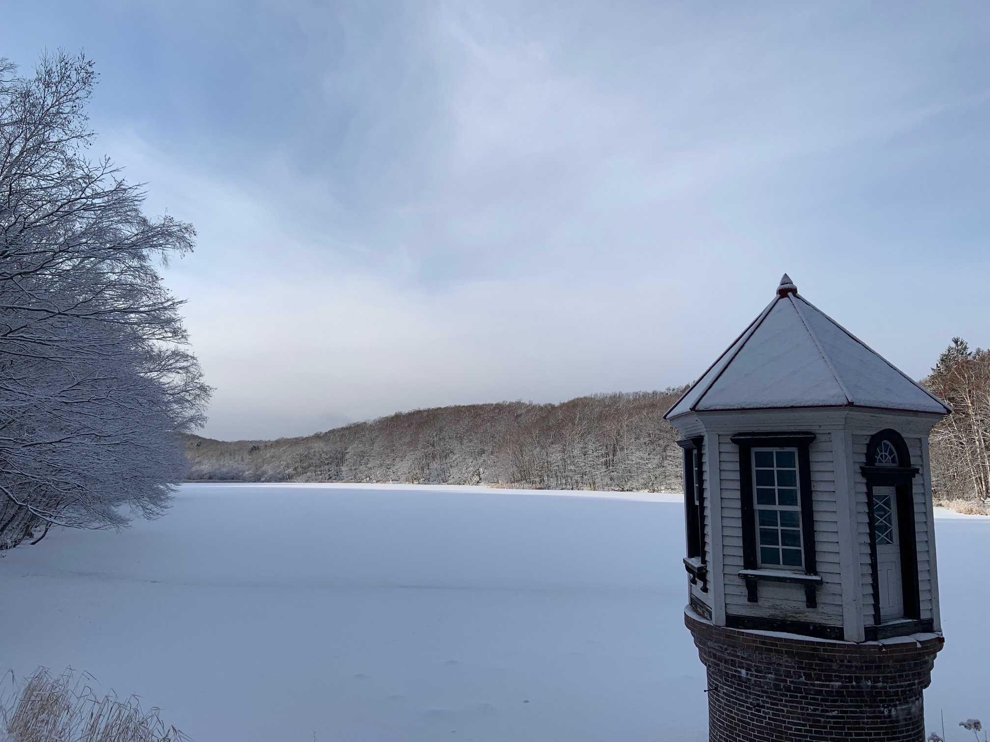 赤い屋根の取水塔の屋根は今朝は雪で真っ白です。