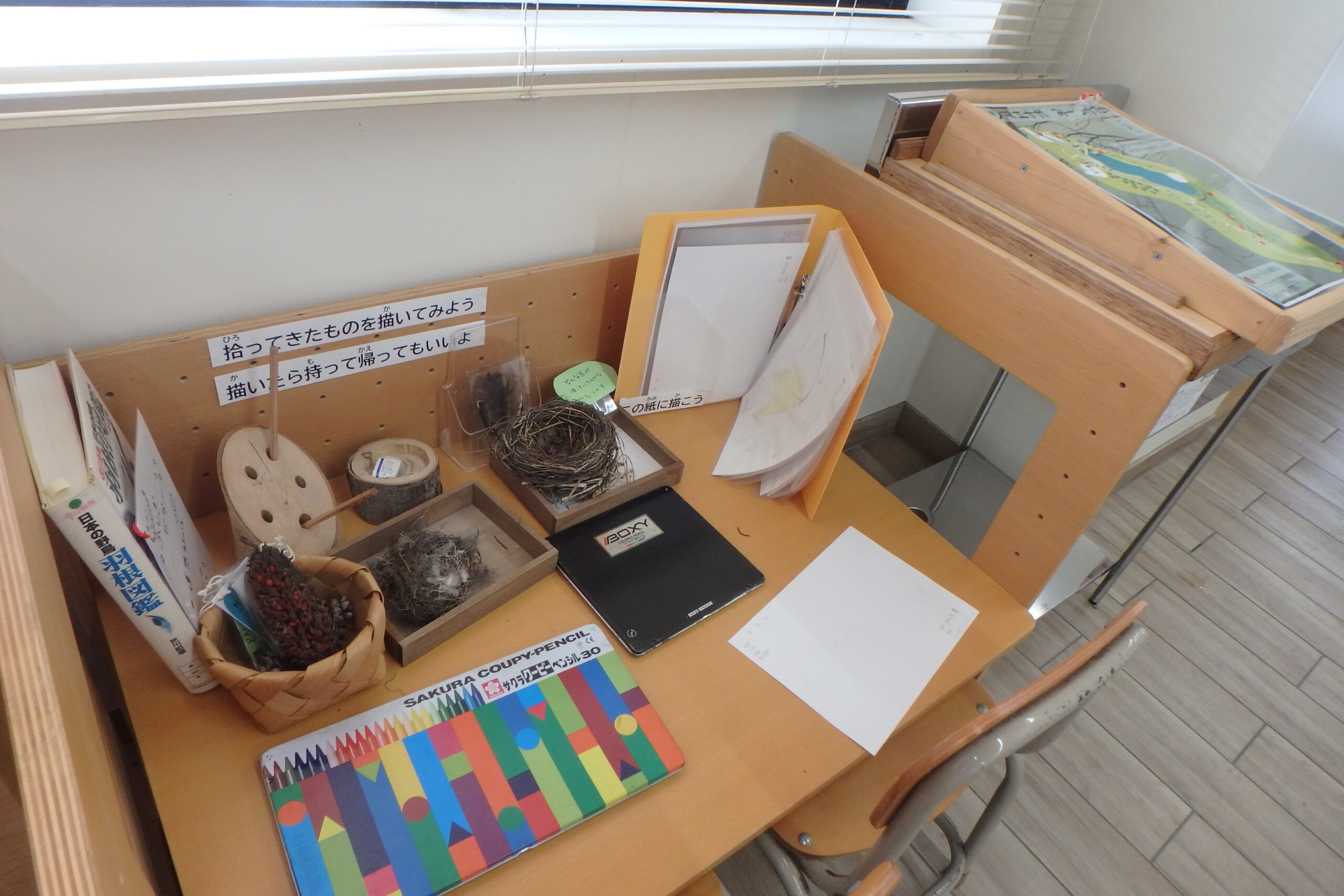 自分で園内で見たもの拾ったもののスケッチをしても良いですし、置いてある鳥の巣、羽根などの展示物のスケッチも楽しい体験ですね。