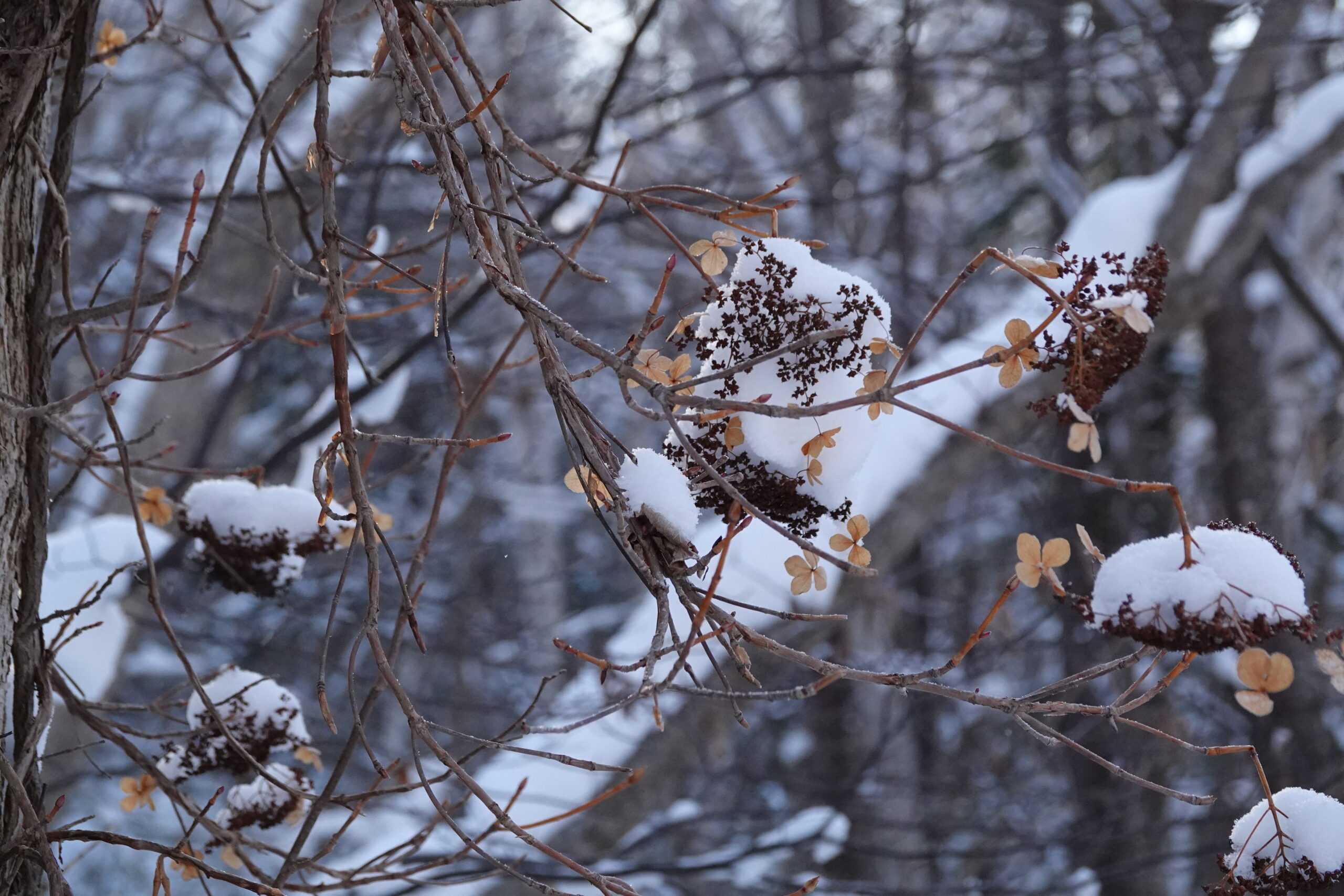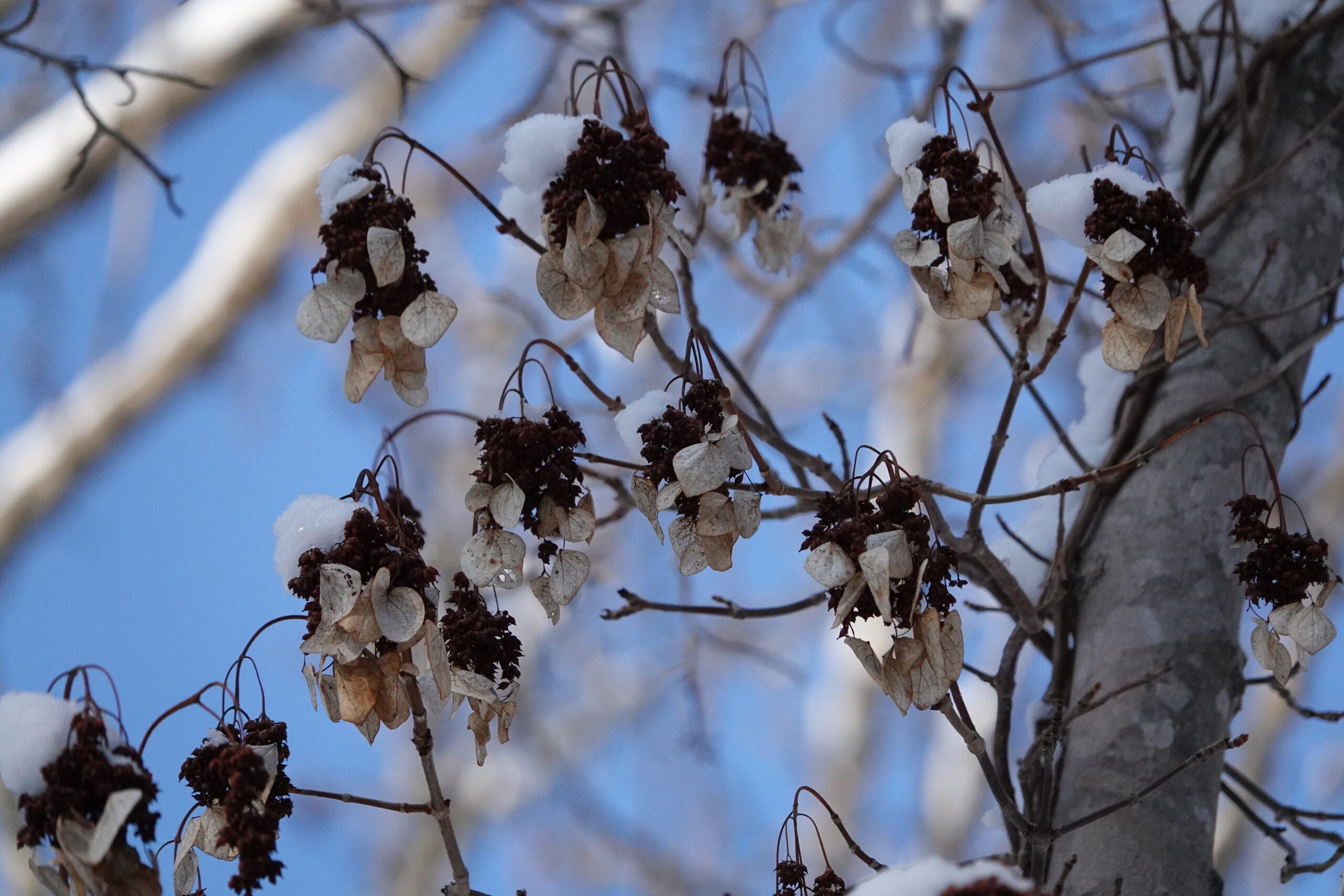 イワガラミ、ツルアジサイ、ノリウツギは夏に花を咲かせていますが、枯れてもそのままついていて、ドライフラワーになります。