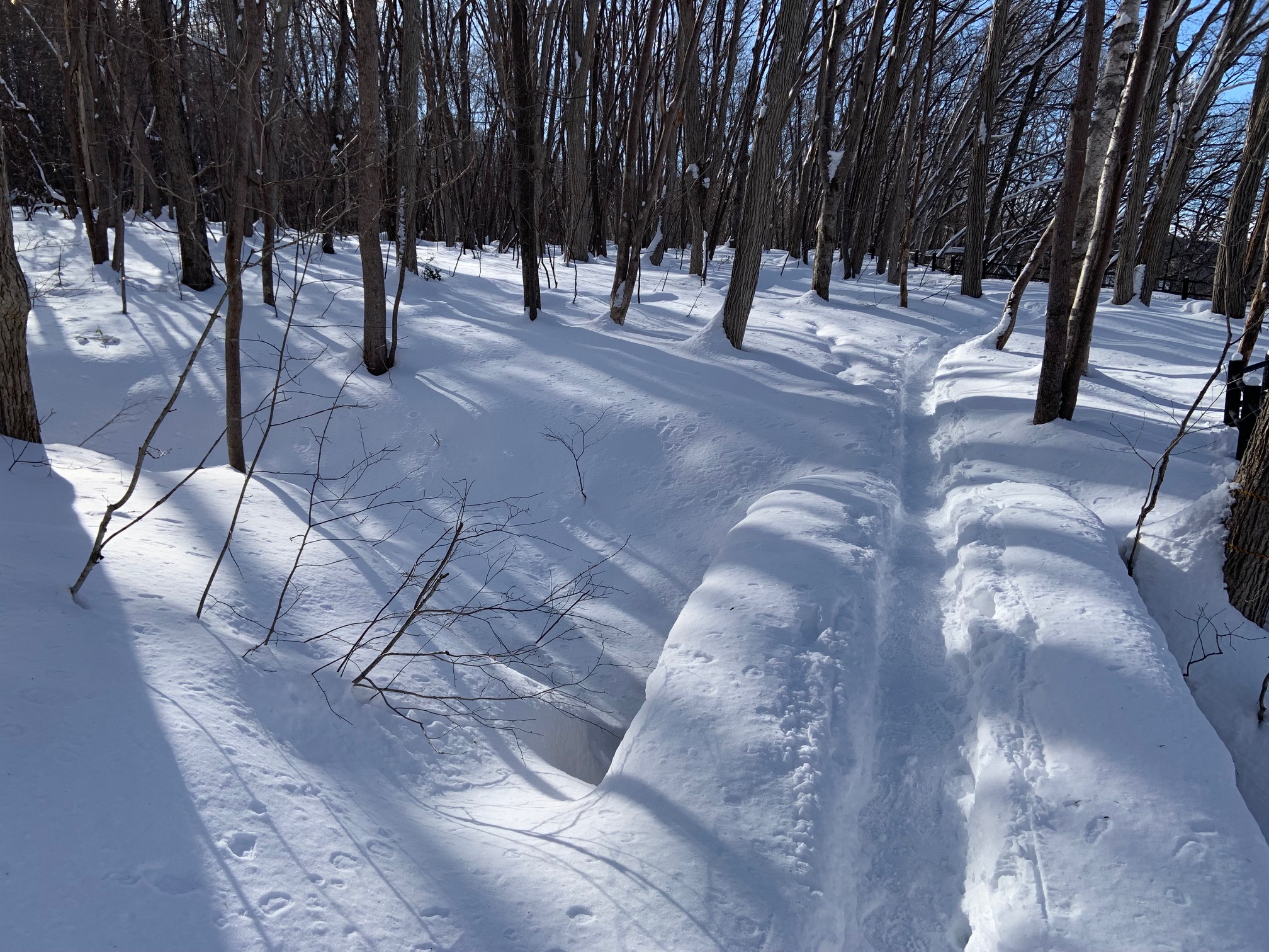 今年の西岡公園は例年よりも積雪が少ないのですが、それでも木道にも雪が積もっています。