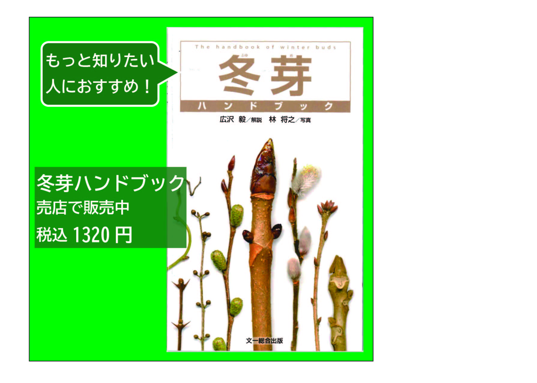 管理事務所では西岡公園のボランティア「植物の会」の皆さんが作ってくれた冬芽の写真と見分け方のヒントが入っているラミネート資料(100円)を販売しています。