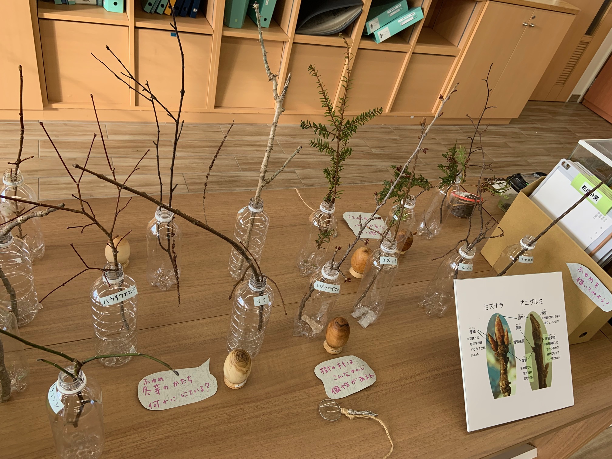管理事務所では園内で見られる様々な樹種の冬芽のついた枝を展示しています。