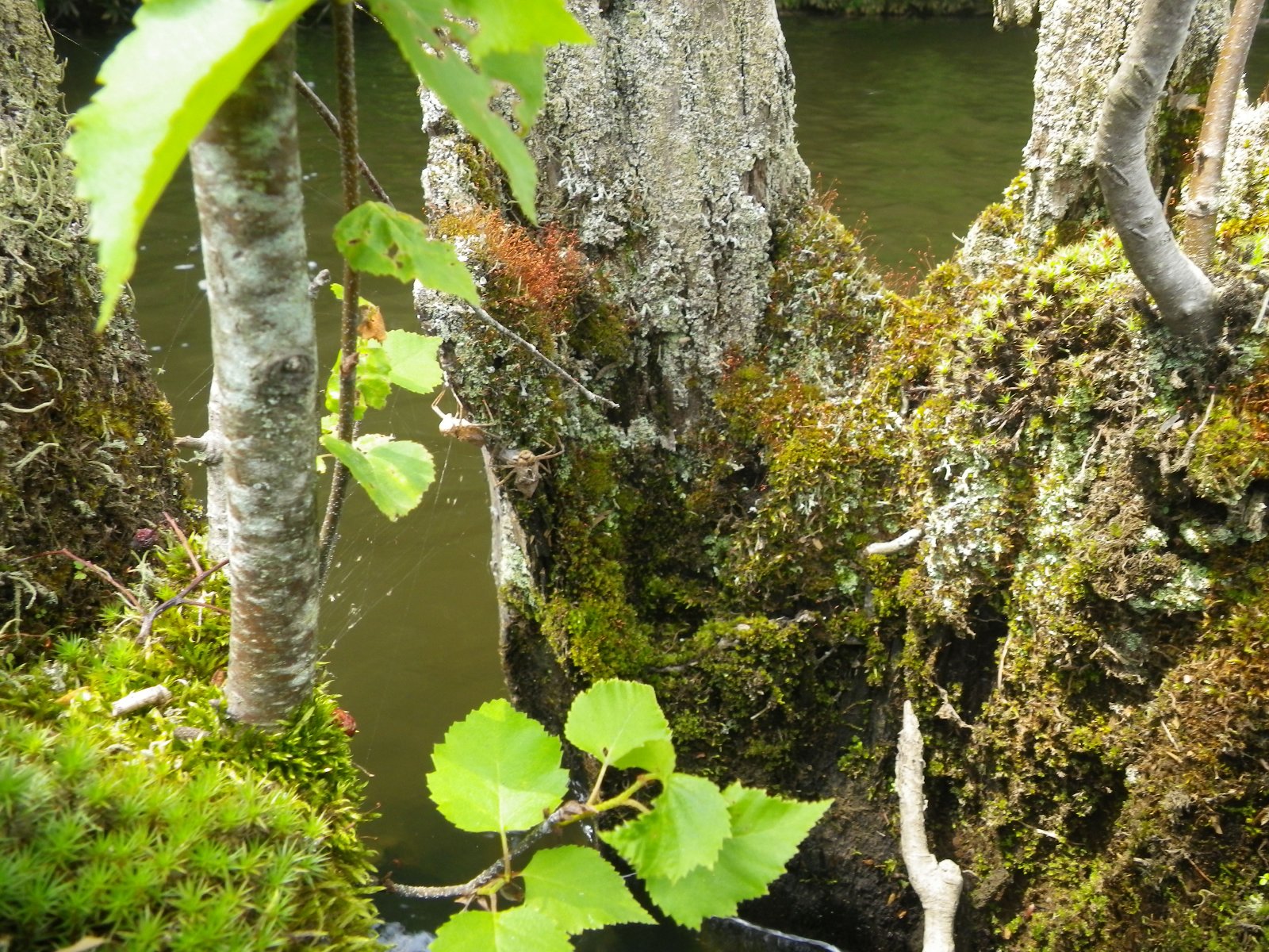 池から突き出た朽ち木の中でエゾコヤマトンボ(2匹)とコオニヤンマ(1匹)のヤゴの