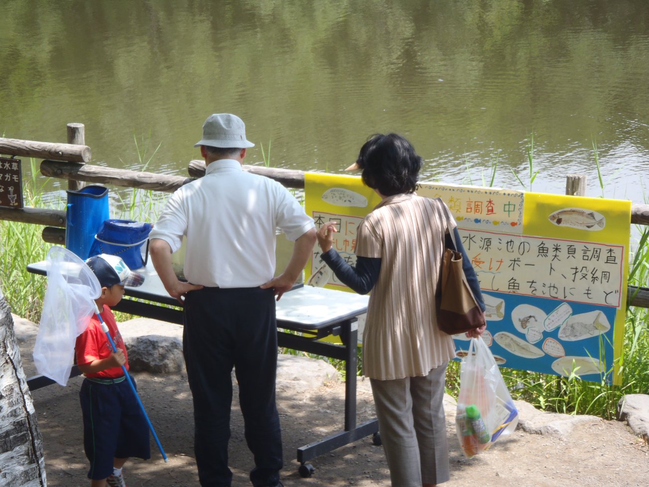 普段は、なかなか見ることができない水源池の魚に、来園者の皆さんも興味津々。