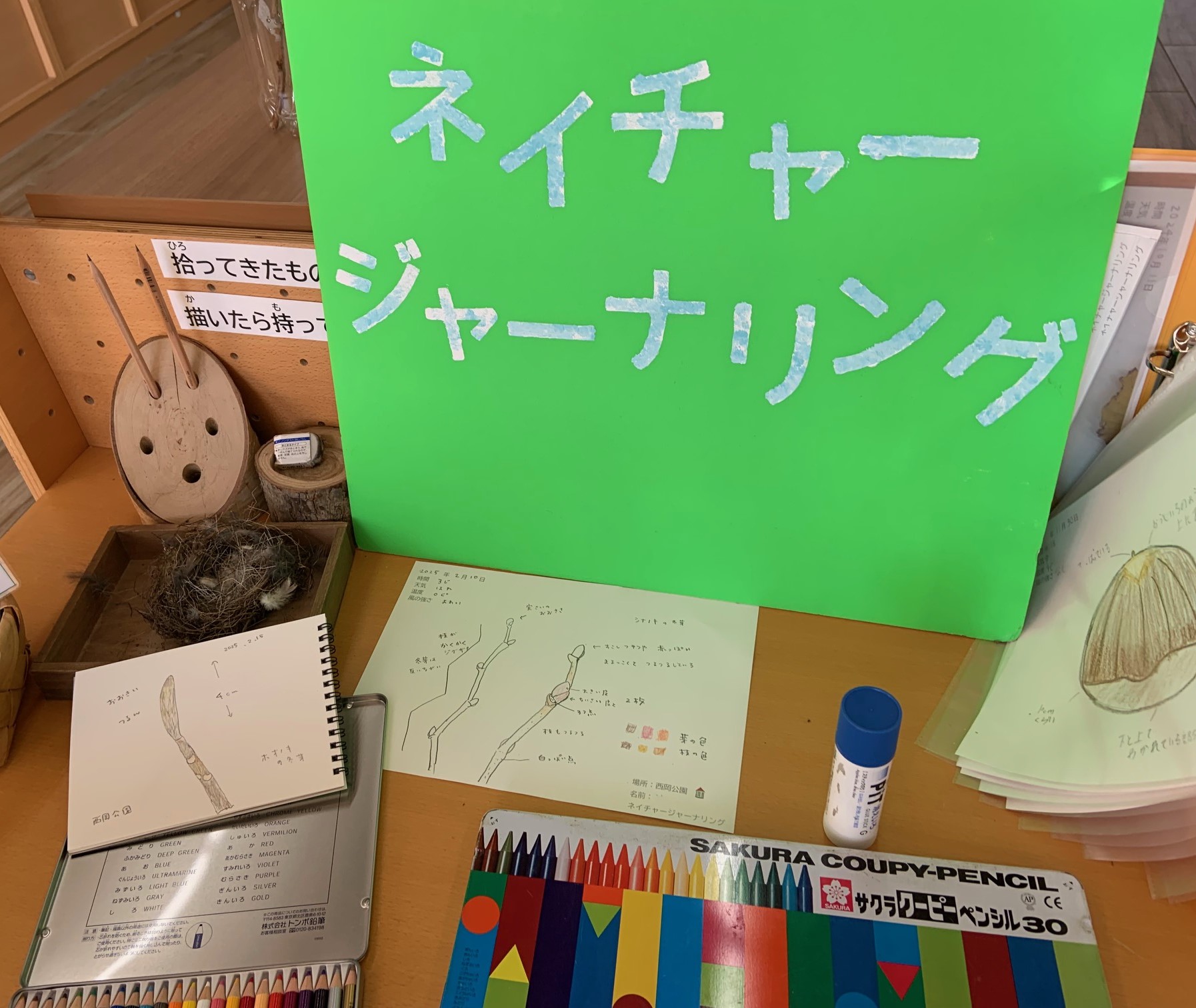 西岡公園の管理事務所では、大人も子どもも簡単にできる方法、自然観察をして記録に残す方法のひとつの「ネイチャージャーナリング」を紹介しています。