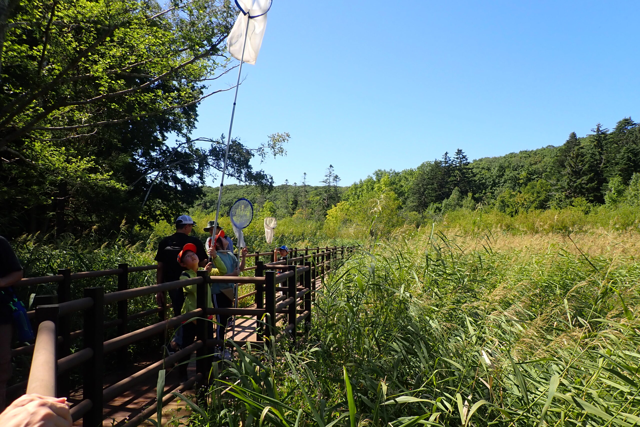 広場の草地や湿原に行ってトンボの採集をしますよ。