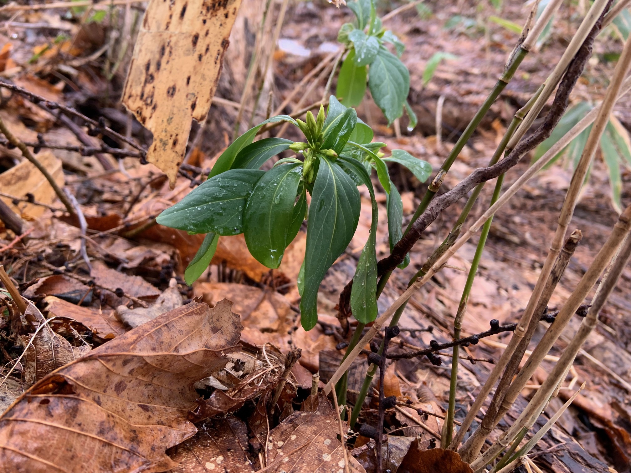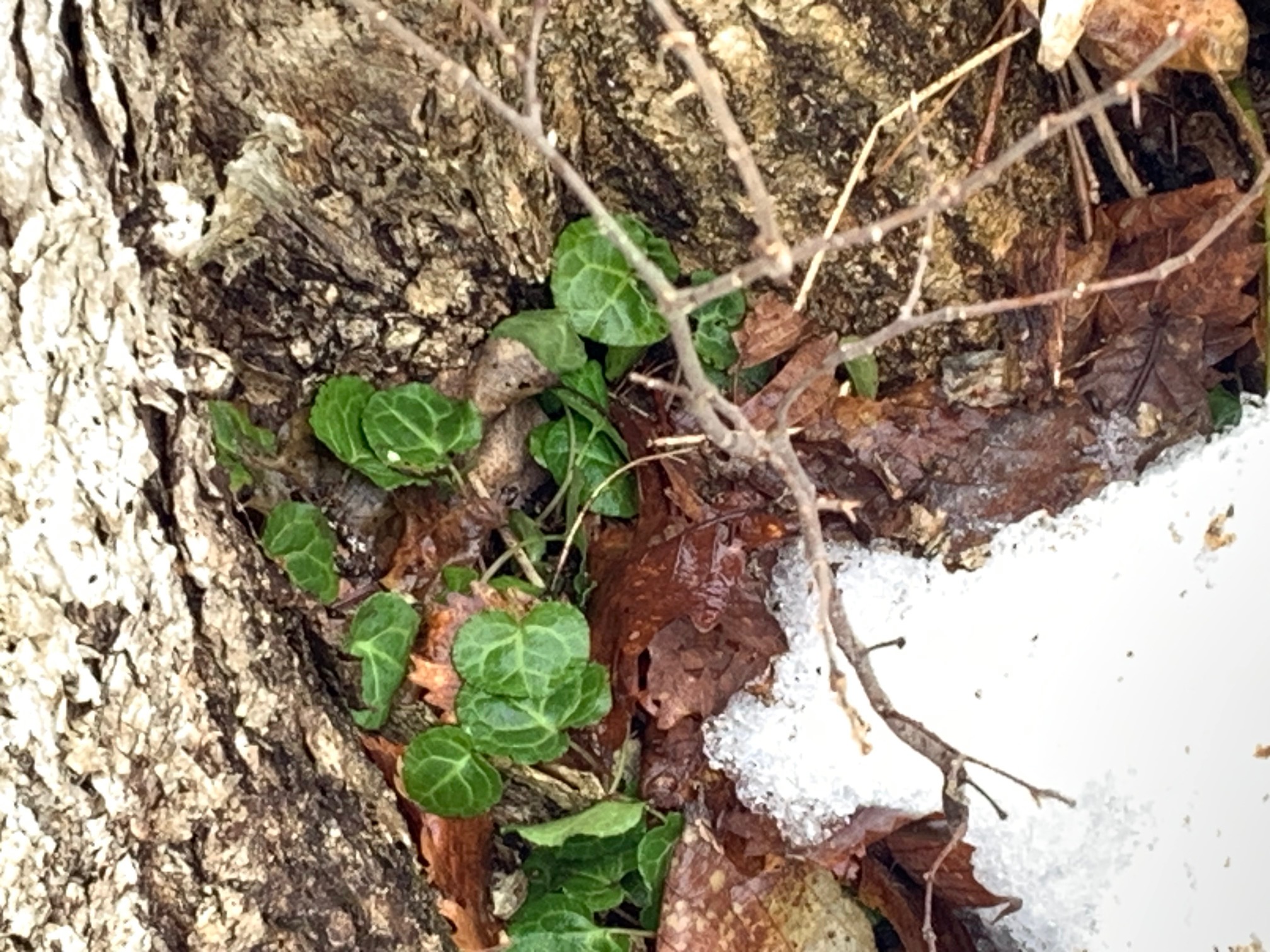 園路沿いでは、雪の下から常緑のジンヨウイチヤクソウの葉の緑が嬉しいです。