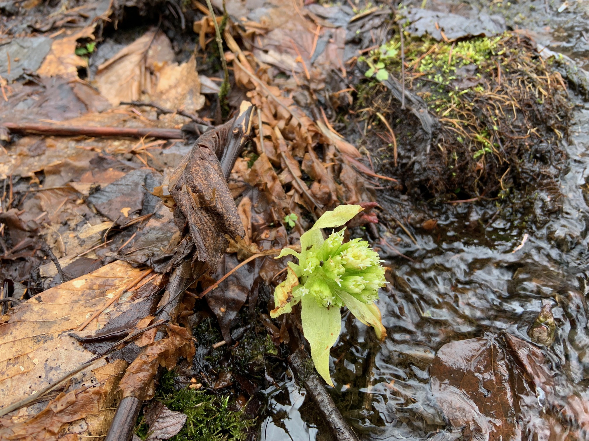 水の中からミズバショウの芽が出ているのを見つけましたよ。