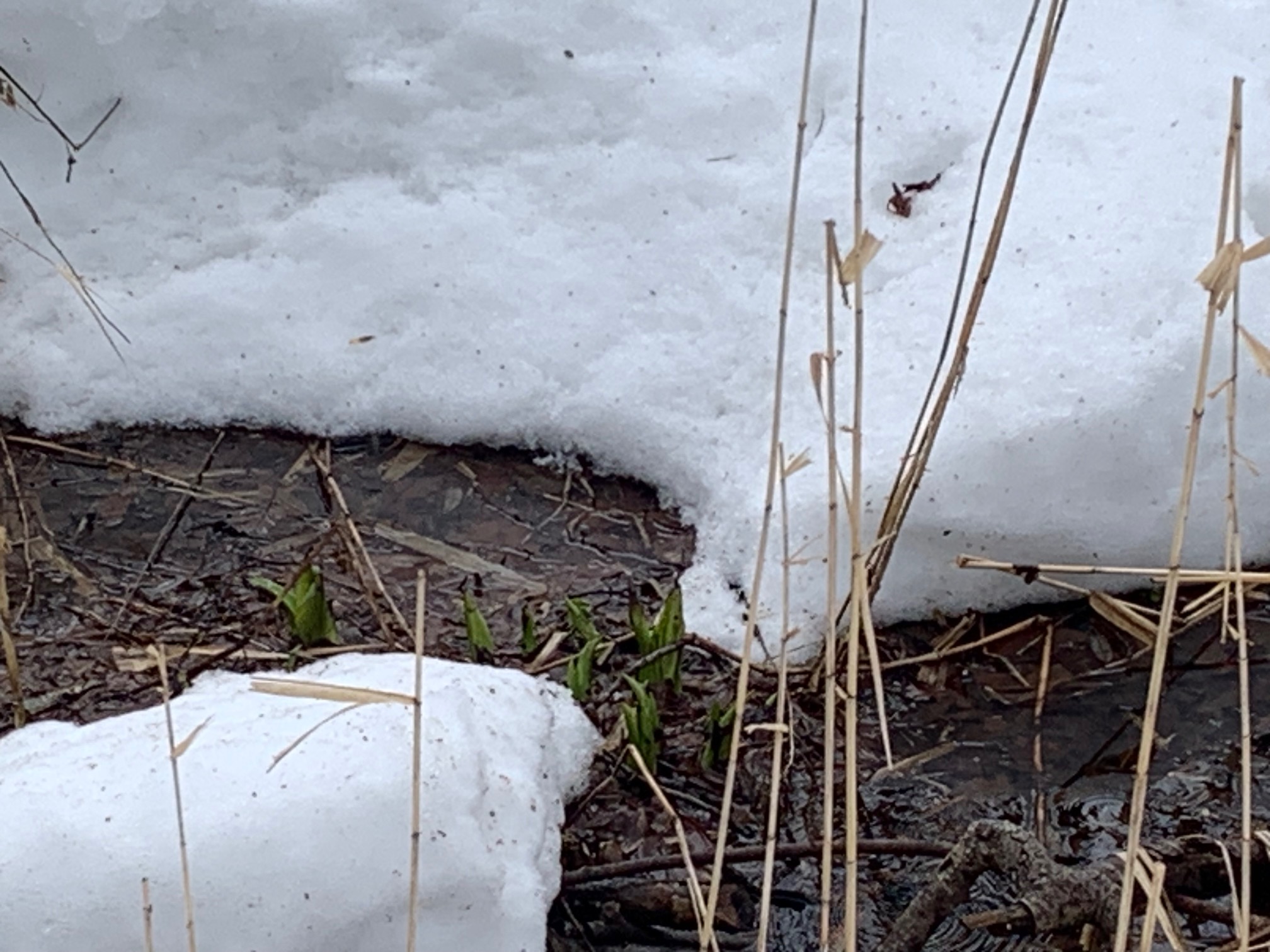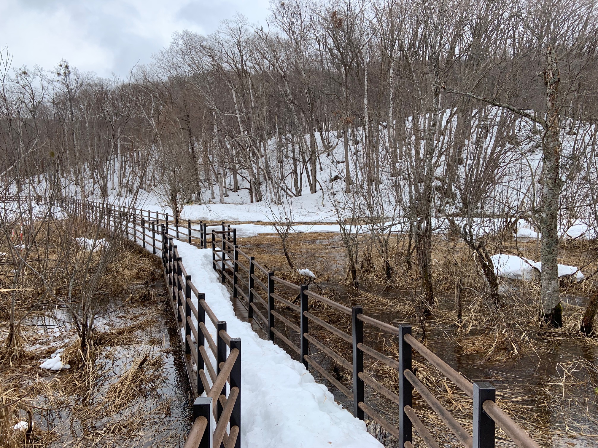 周りの湿原は雪で倒されたヨシが水につかっています。
