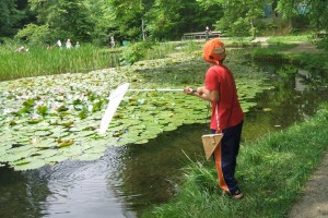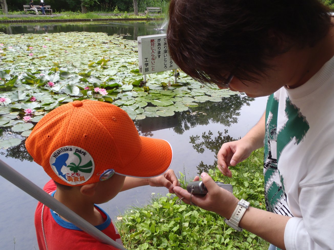 北海道大学には、大野池という池があり、そこにどんなトンボがいるのかをみんなで調べてみました。ハスの花が浮いていたり、きれいに整備されていたりと、西岡公園とは違う環境の池でしたが、クロイトトンボ、エゾイトトンボなどのイトトンボの仲間が多く見つかりました。