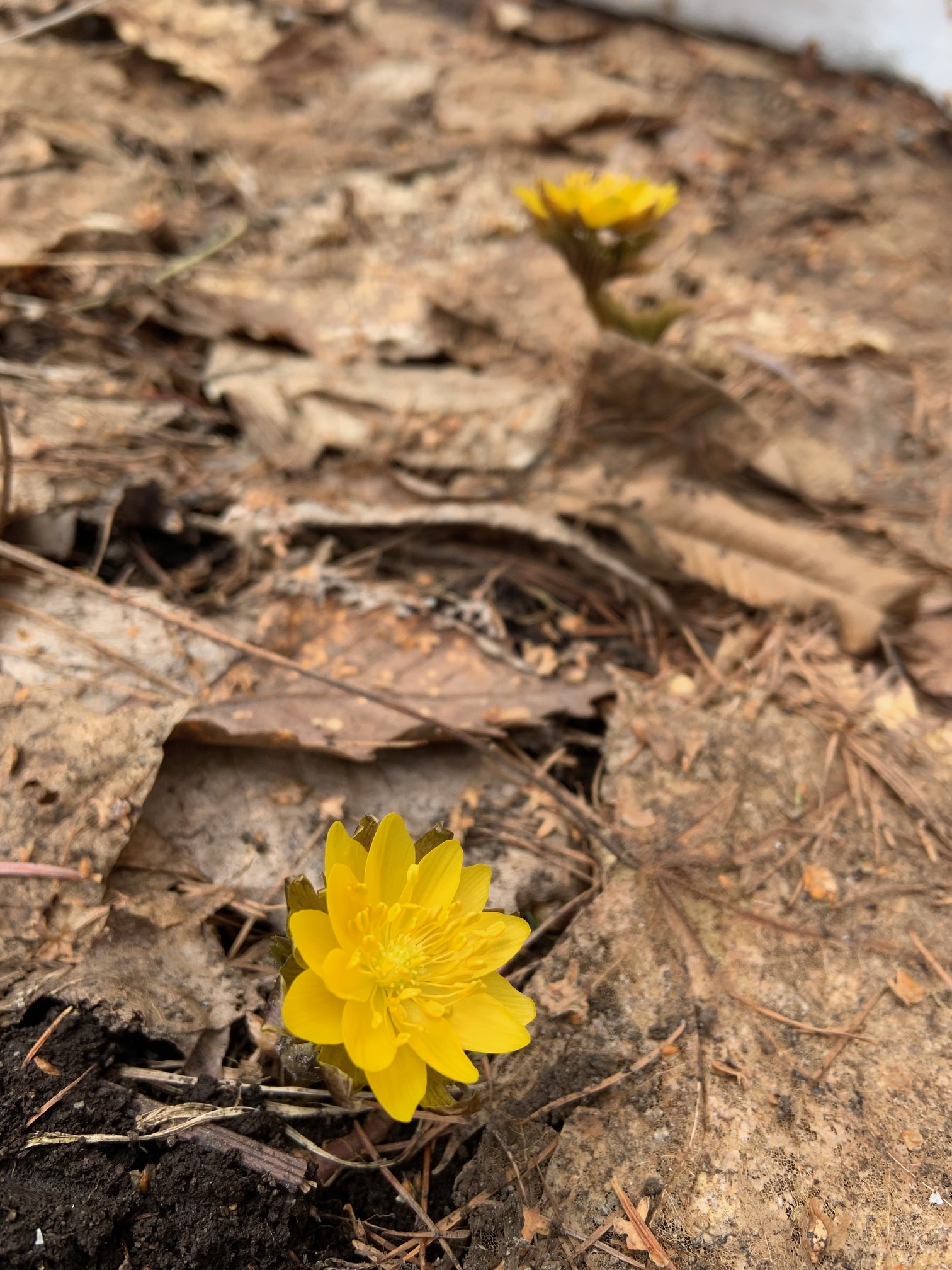 お日様に向かってぱっと開いた黄色いフクジュソウに出会えました。