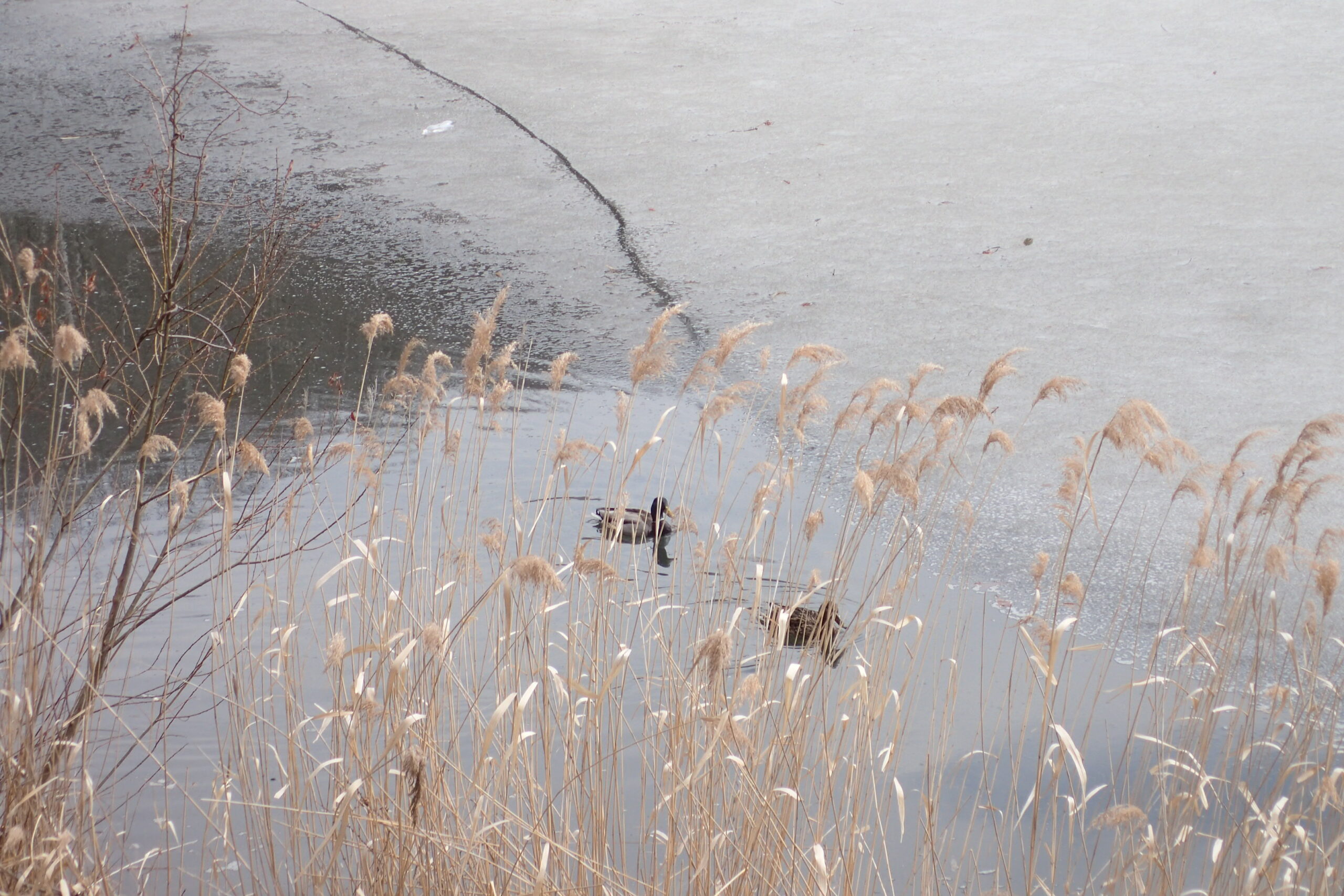 西岡公園の凍っていた池もどんどん融けて今日は半分くらい水面が出ています。