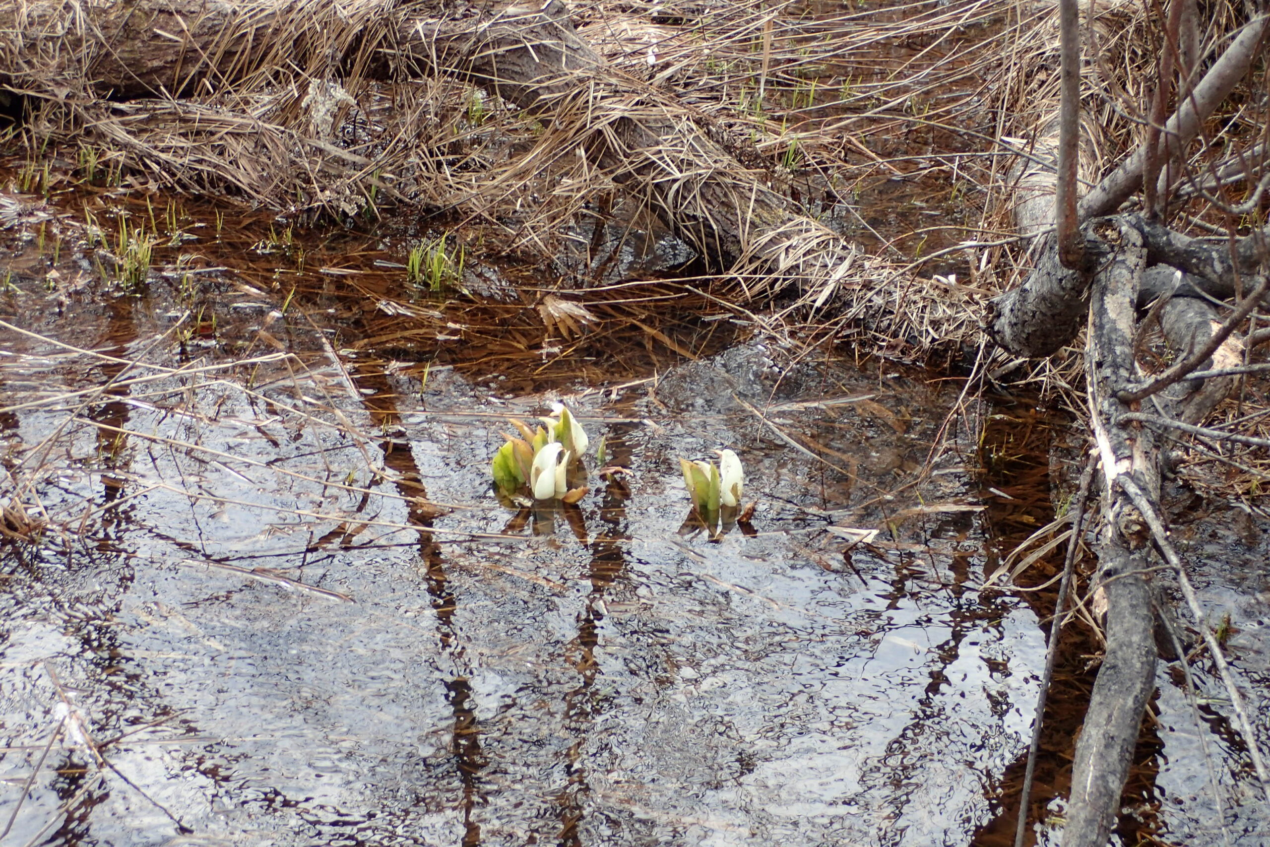 湿原ではミズバショウ白い仏炎苞を見せてくれています。
