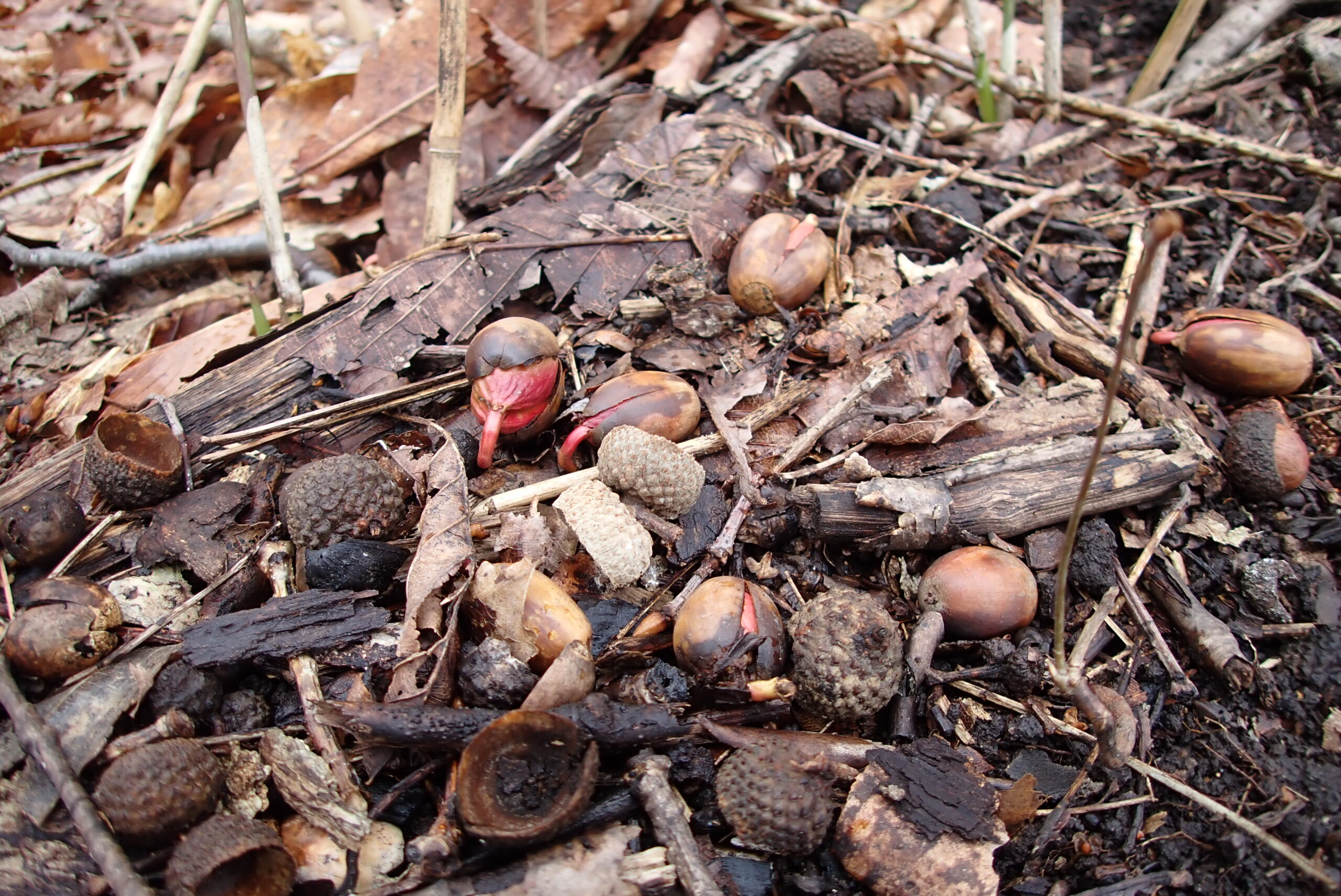 昨年豊作だったミズナラの堅果(どんぐり)から根が土に伸びている様子がみられます。