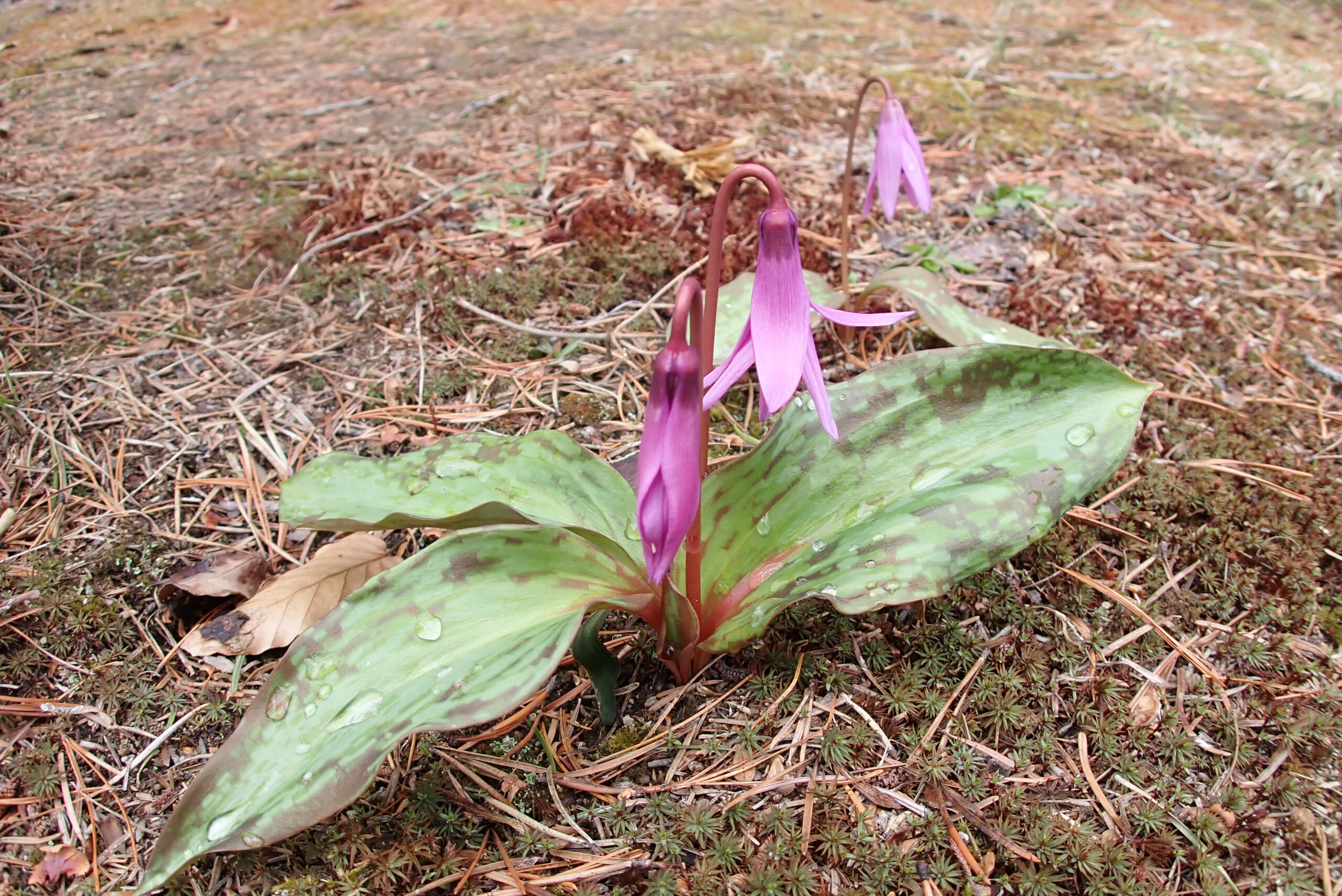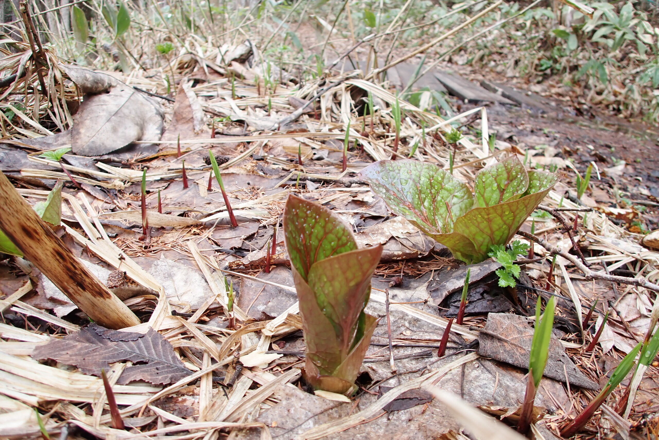 地面から顔を出したばかりのオオウバユリの芽たちはつやつやで葉脈が赤いです。