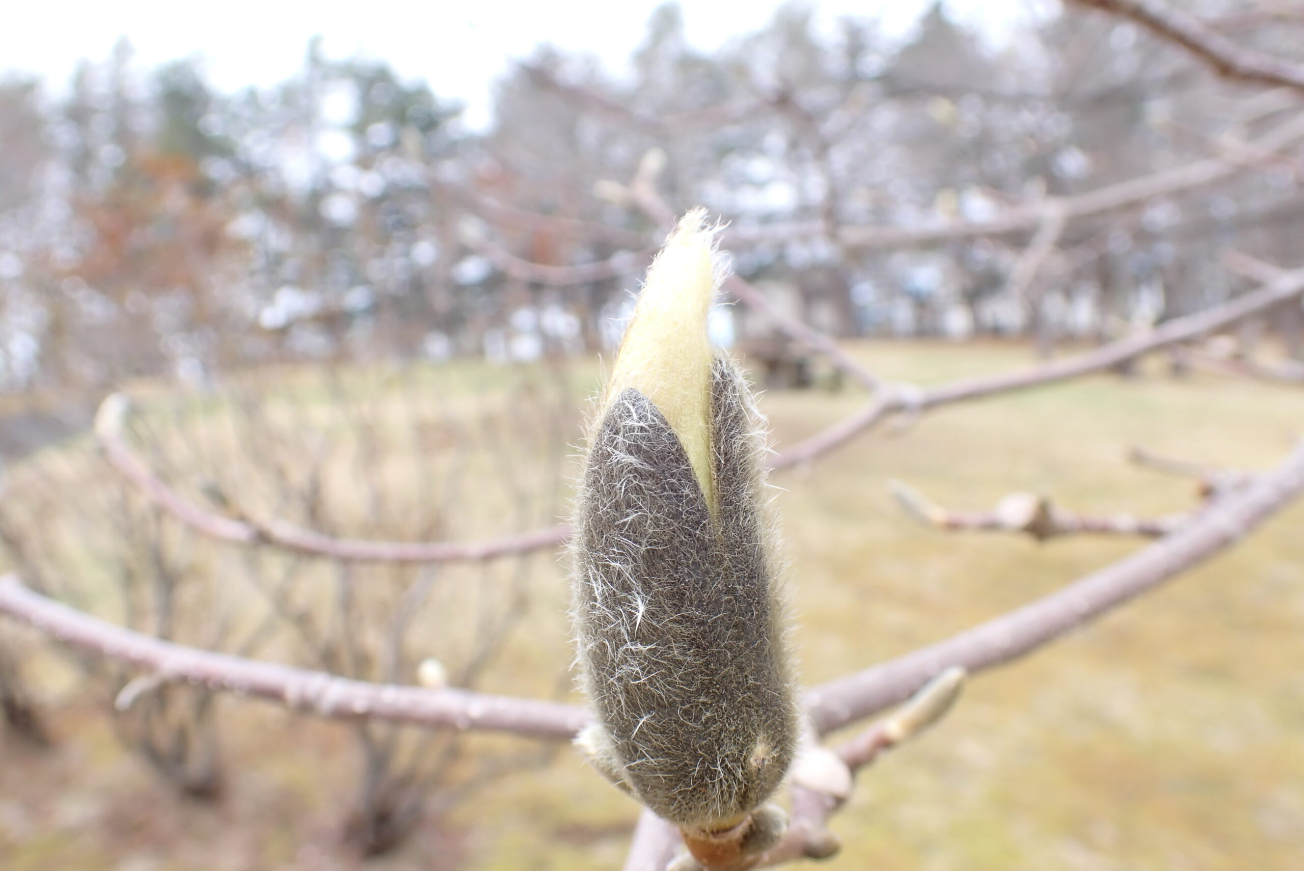 ハクモクレンは銀色の産毛に包まれたつぼみがほころんでいます。
