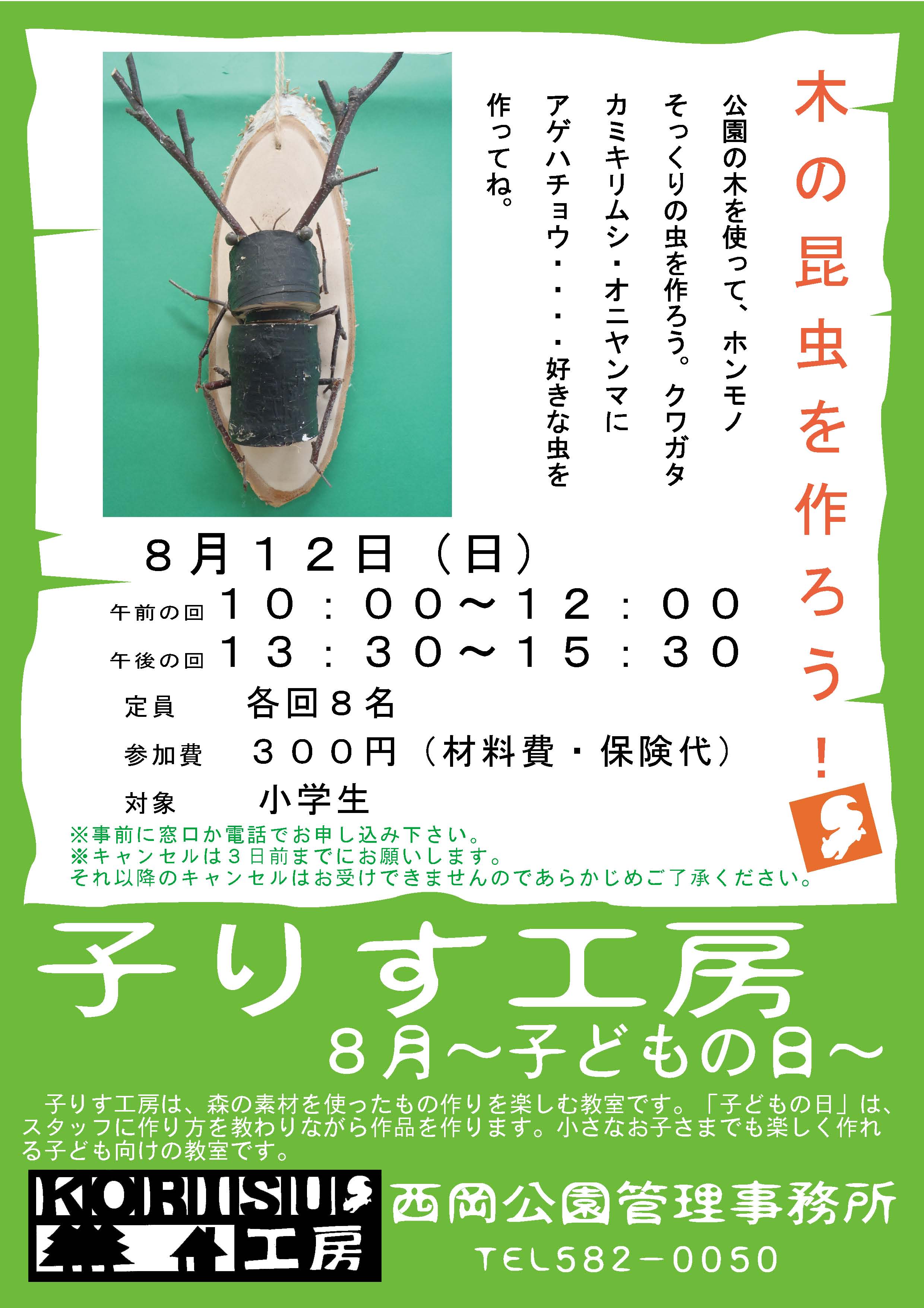 8月の子りす工房~こどもの日は、公園の木で大きな昆虫を作ります。 クワガタ・カミキリムシ・トンボ・・・・・・自分の好きな昆虫を作ってOK! 夏休みの宿題に最適です。 皆様のご参加、お待ちしています。