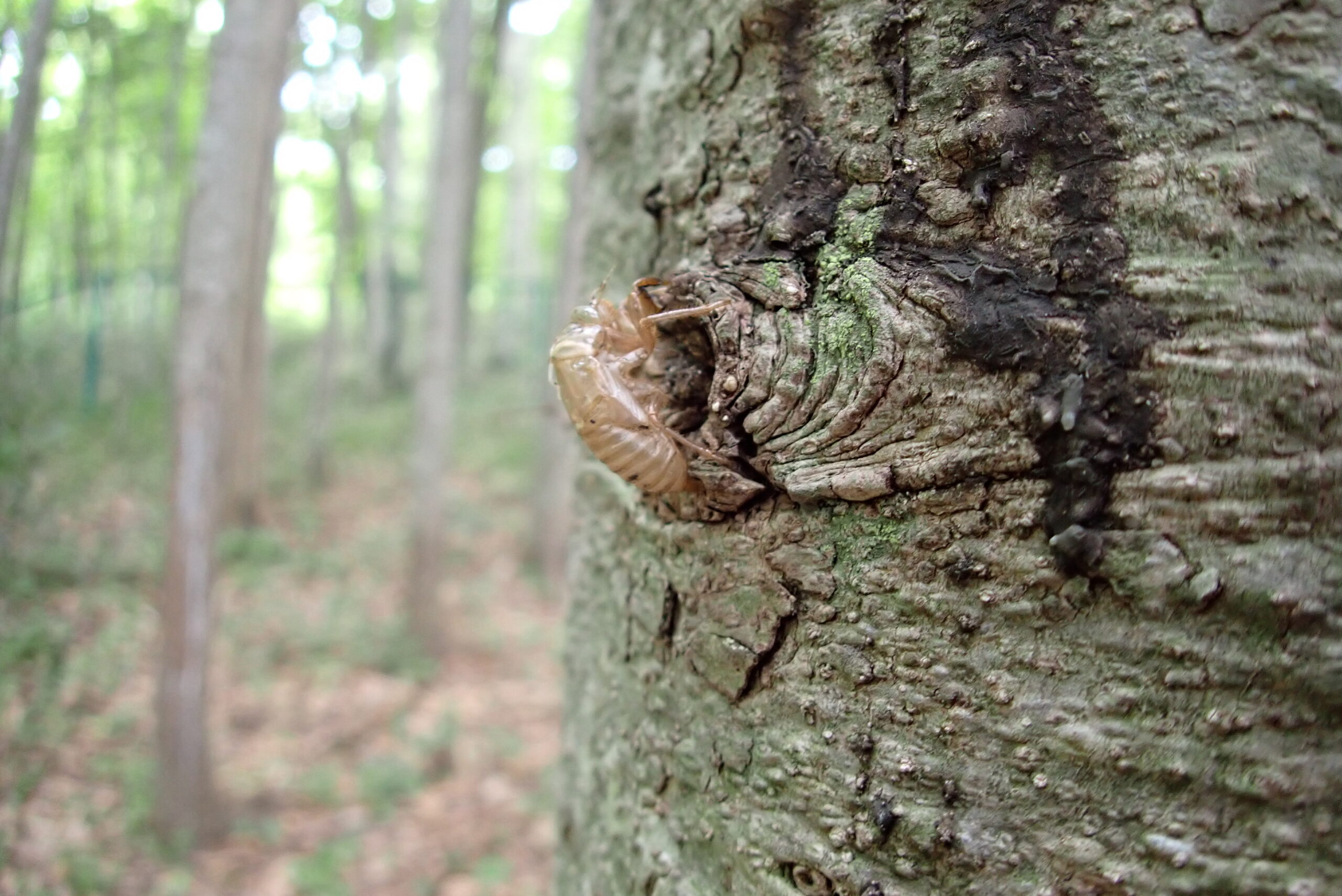 エゾハルゼミの抜け殻が樹の幹にたくさんついています。エゾハルゼミが朝からずっと鳴き続けています。