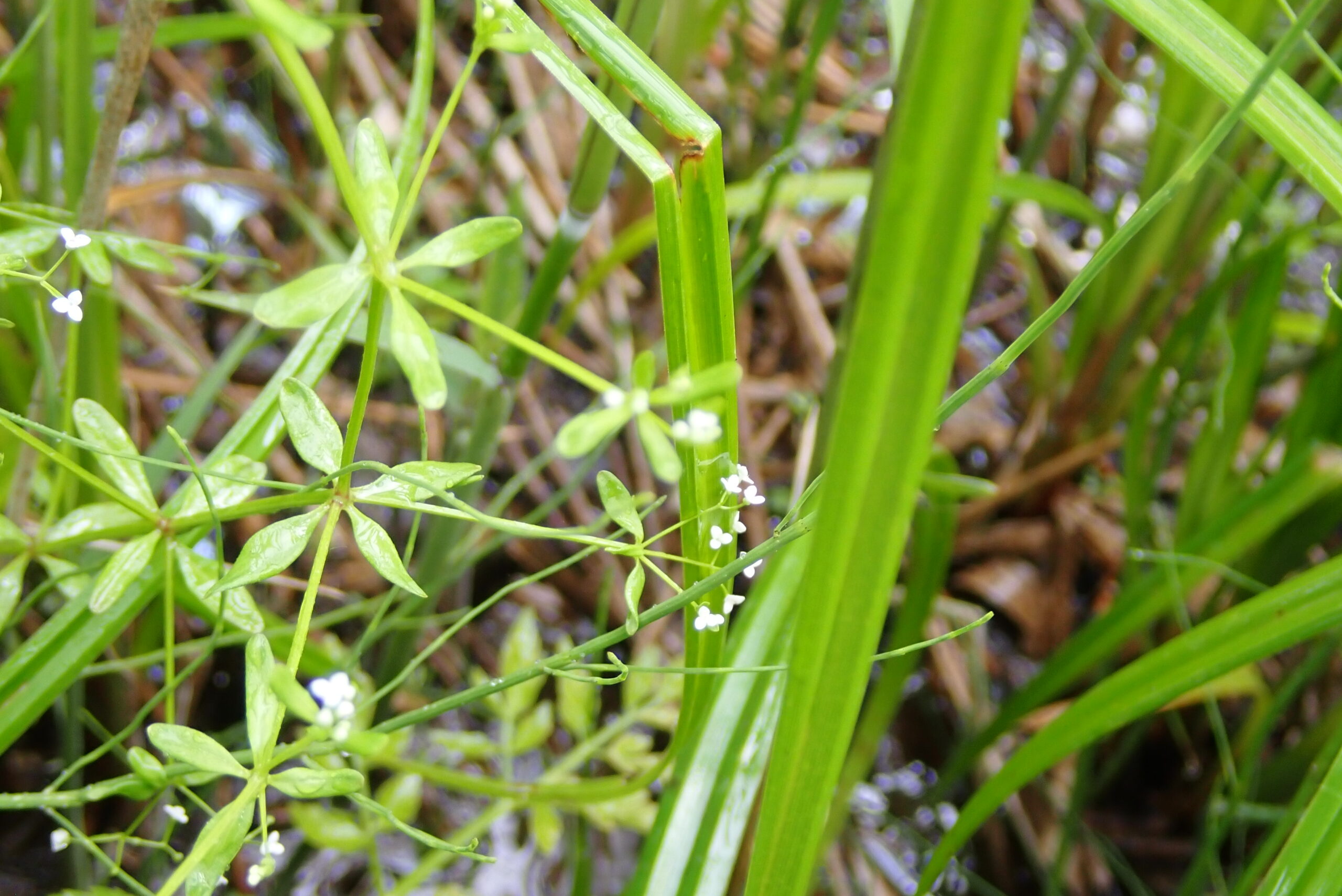 ホソバノヨツバムグラがほかの草に寄り掛かるようにひっそりと咲いています。