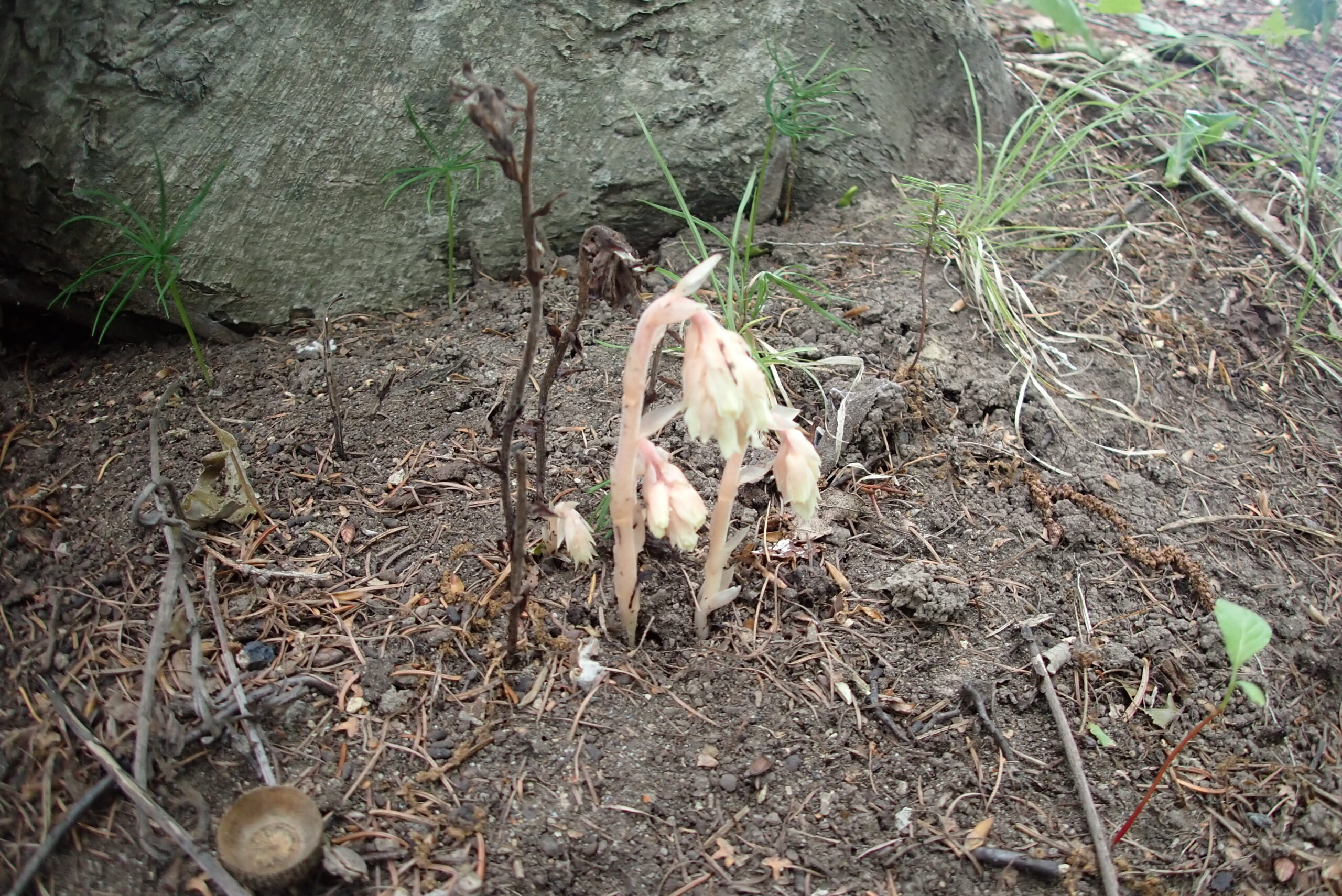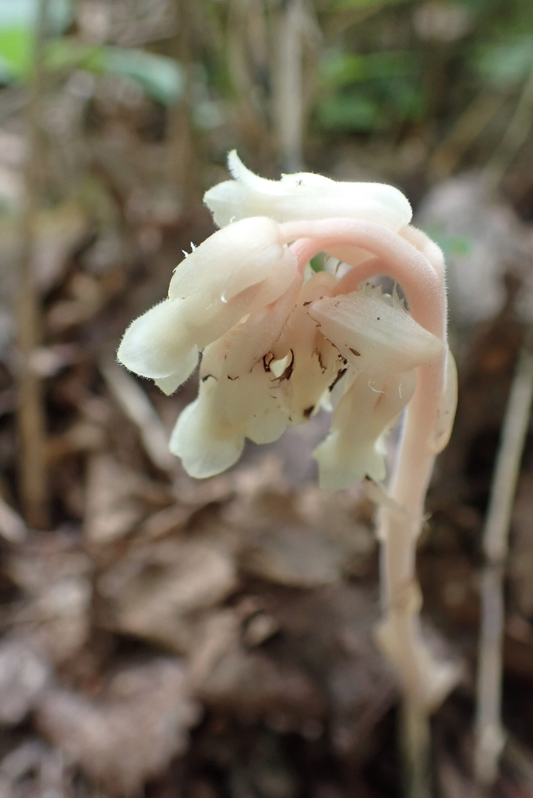 シャクジョウソウは「菌従属栄養植物」といって光合成しないで菌類の菌糸から栄養を奪って生きる植物です。