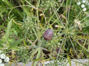 赤と黒の色が交互に並んでいるこの虫は「アカスジカメムシ」と言うそうです。ドクゼリの上にいるのをよく見かけていたので、写真を撮って調べてみると、セリ科の植物によく付いているとのことでした。写真が若干ピンボケしているのが残念ですが、実物はとてもキレイですよ。