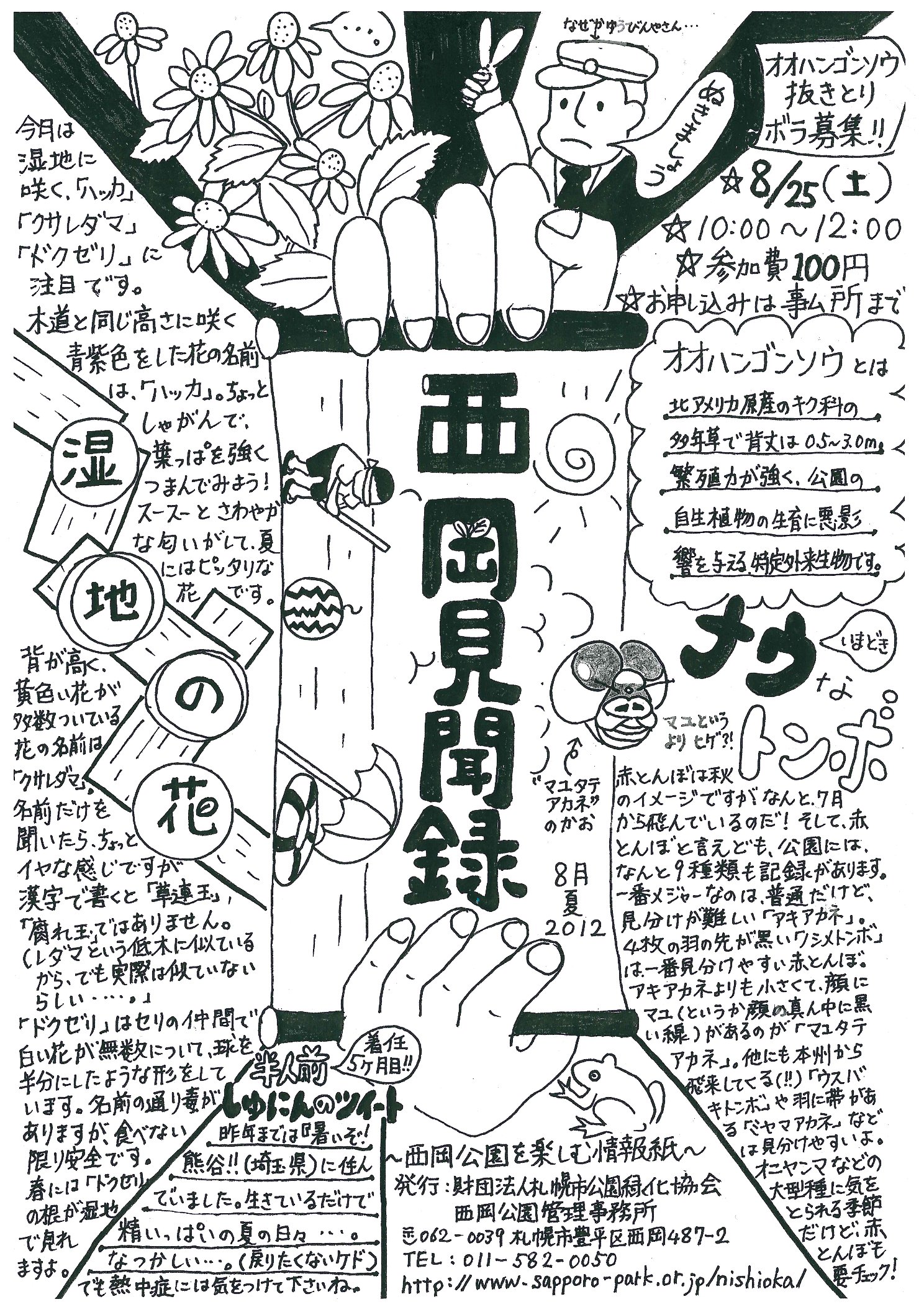 表面では8月に湿地で咲く花や飛んでいるトンボのの特集、25日に行われる「オオハンゴンソウ抜き取りボランティア」の募集&オオハンゴンソウの紹介がされています。