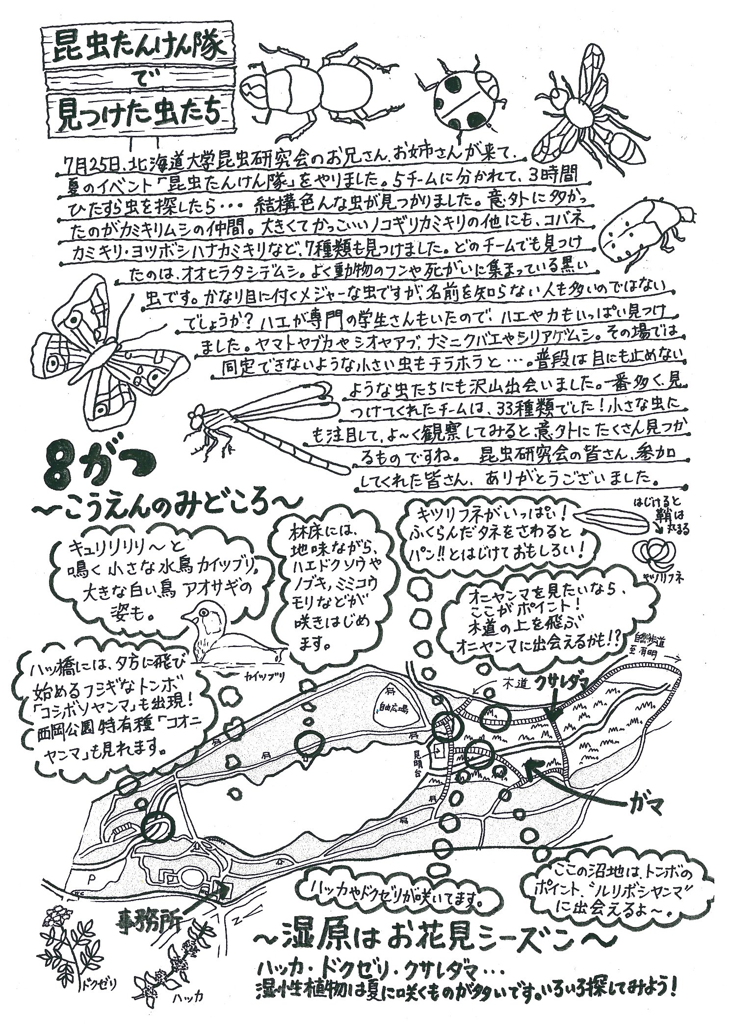 裏面には7月に行われた「昆虫たんけん隊」のレポートや8月の公園の見所紹介となっており、イベントの様子や捕まえられた昆虫について書かれています。