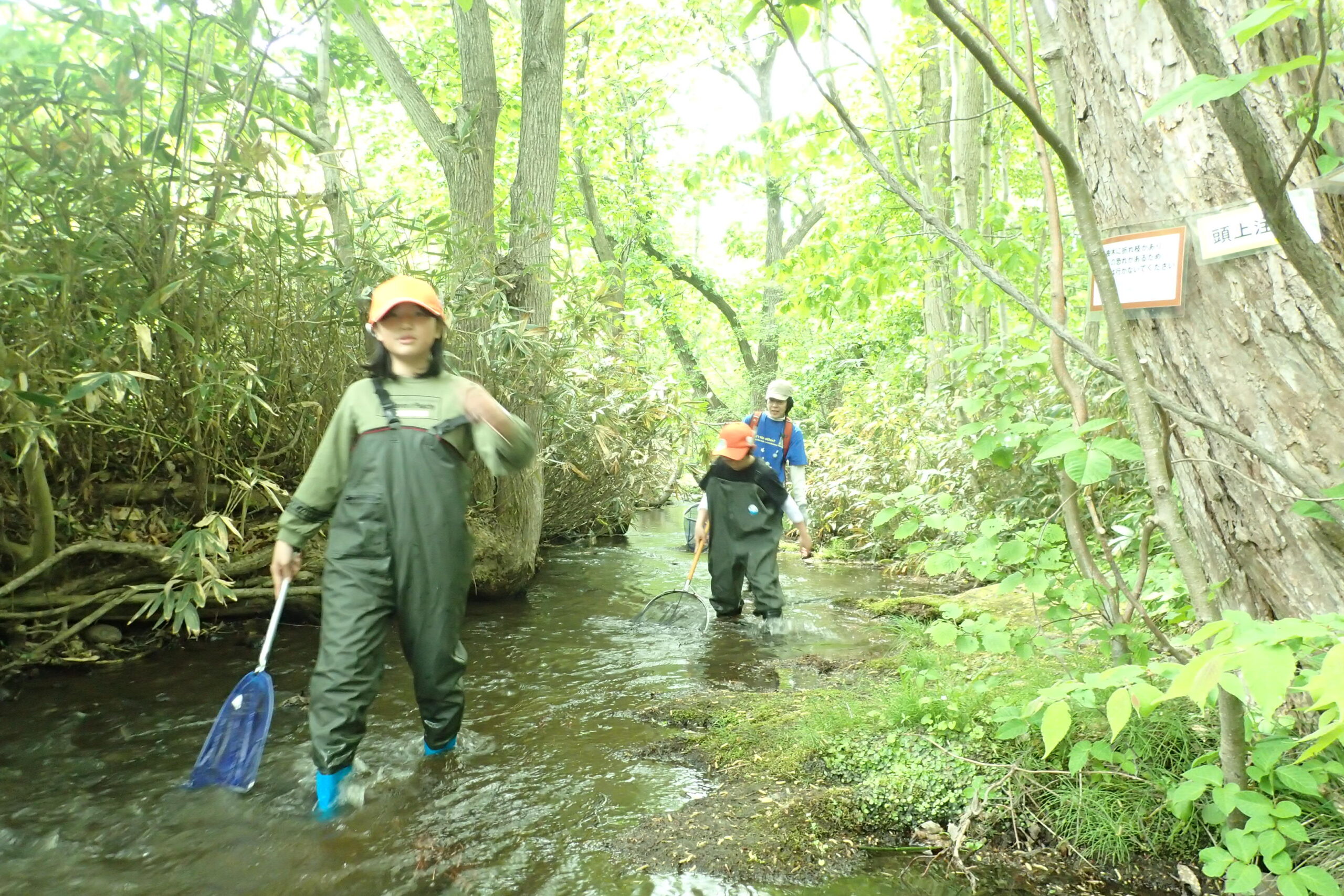川に入って、たも網で生き物を探してみよう。たも網の使い方もおぼえられるよ!