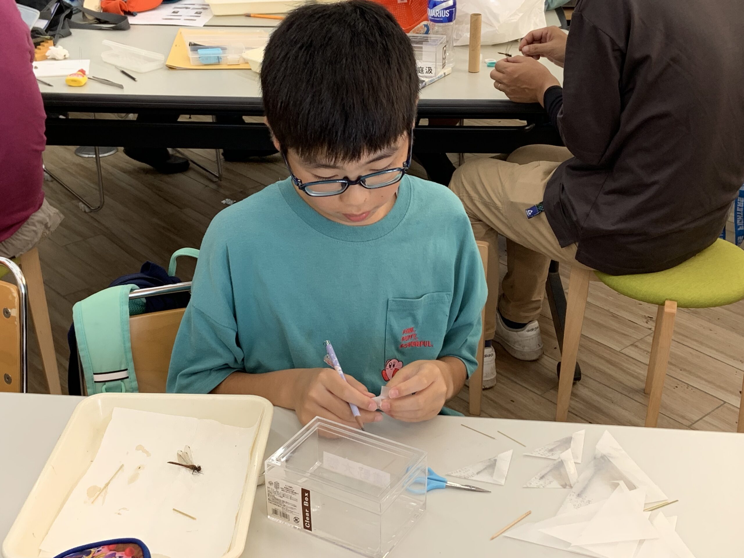 管理事務所に戻ったら恒例のトンボの標本作りです。
