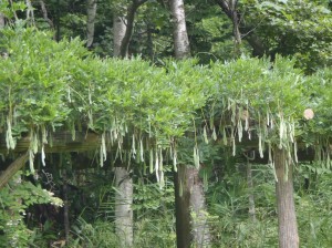 現在のフジ棚ではフジの実がぶら下がっています。えんどう豆のような見た目をしていますが、食べないでくださいね。10月くらいになると実が茶色くなって中から種が出てきますよ。