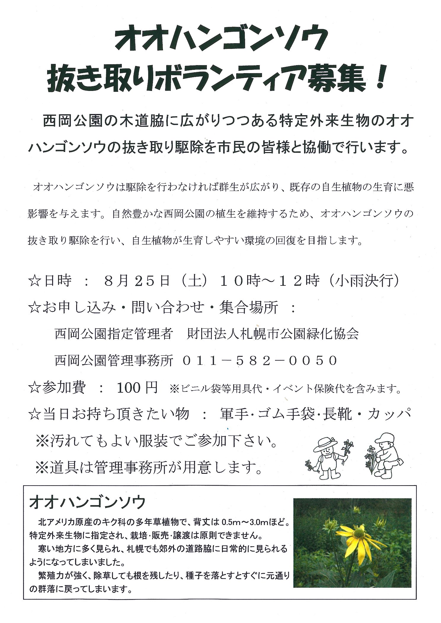 西岡公園の湿地で少しづつ増えてきている特定外来生物のオオハンゴンソウ。これ以上広がらない様に今年も抜き取り作業を行います。皆様の参加をお待ちしております。