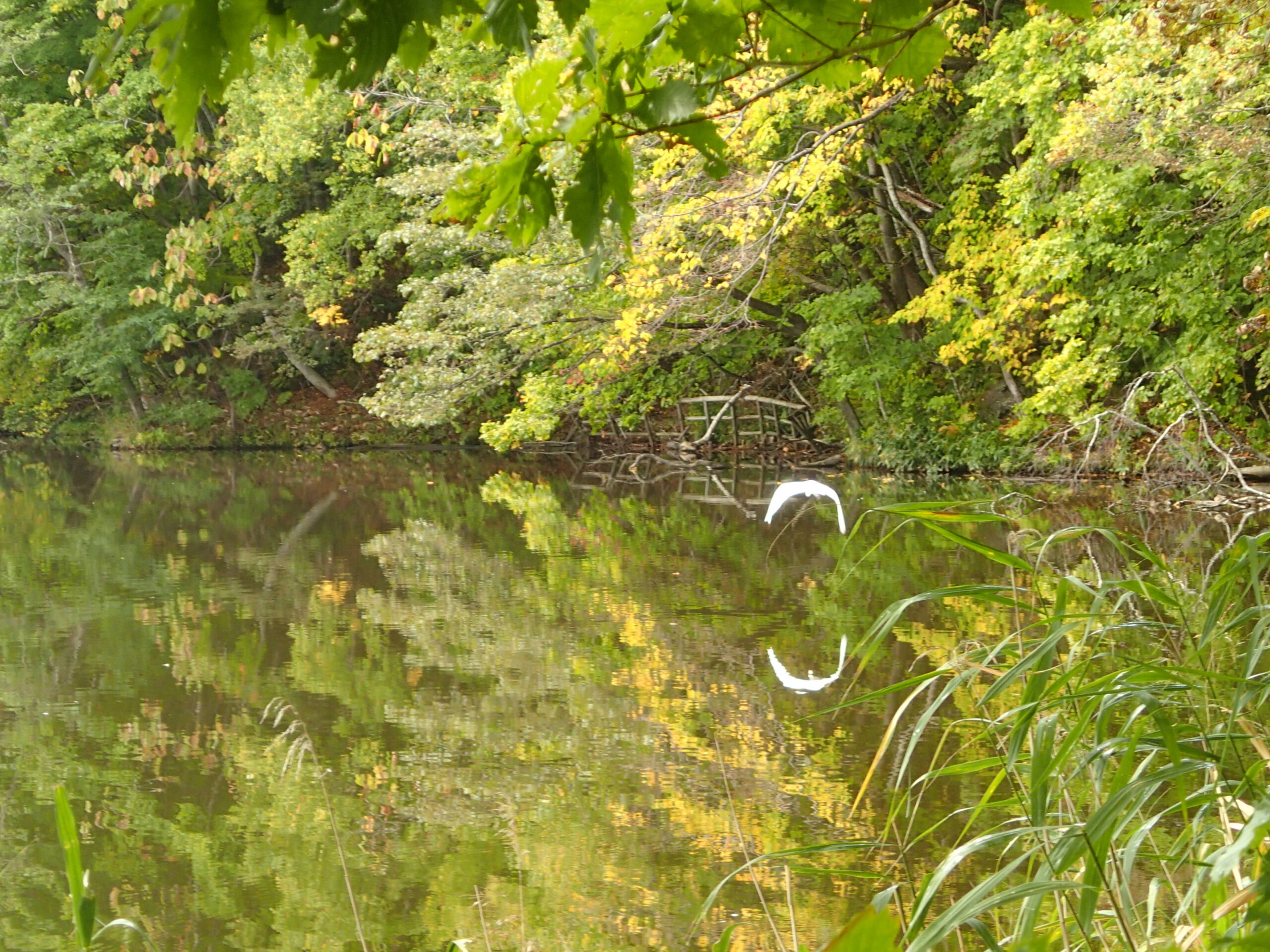 池の上を飛ぶ白いサギがいました。ダイサギでしょうか。