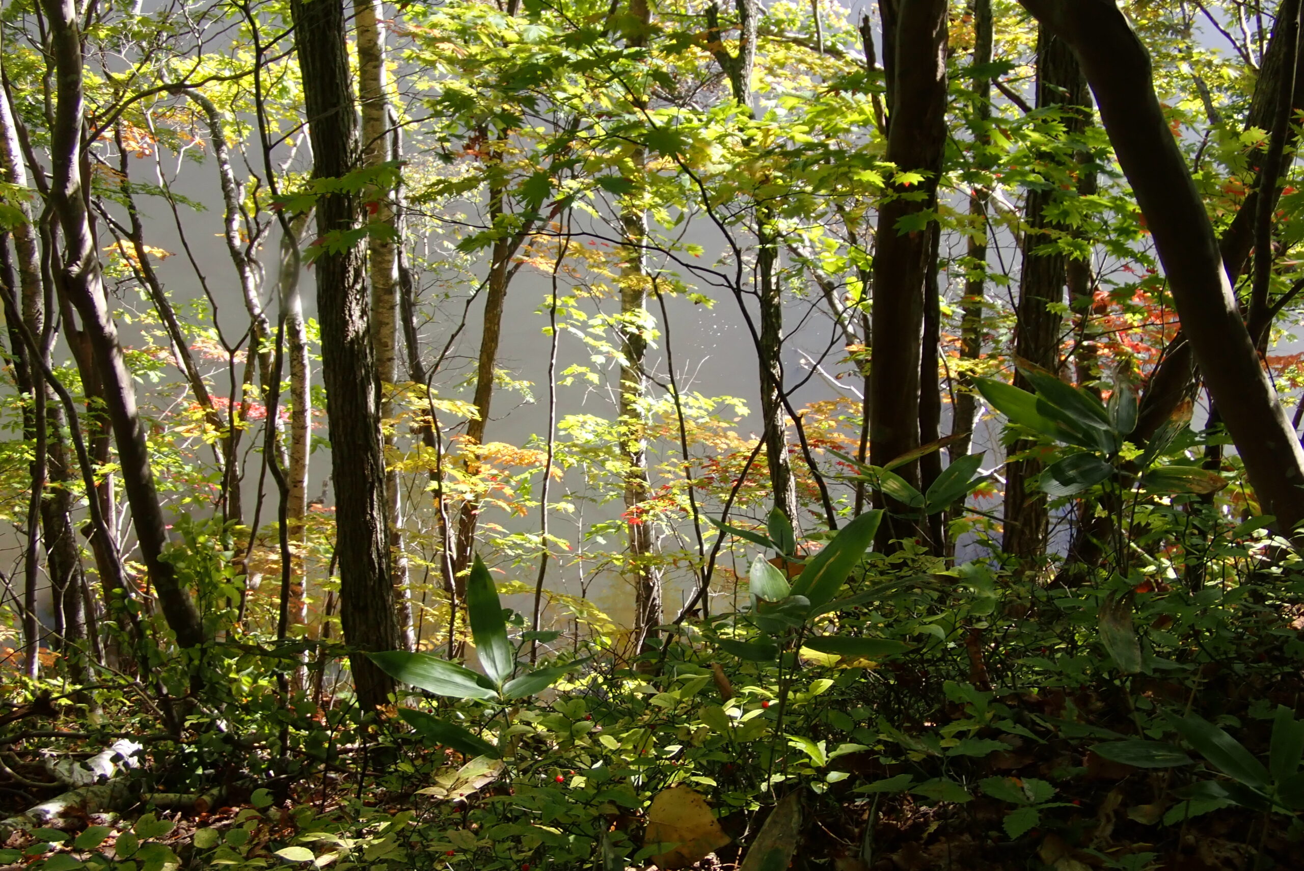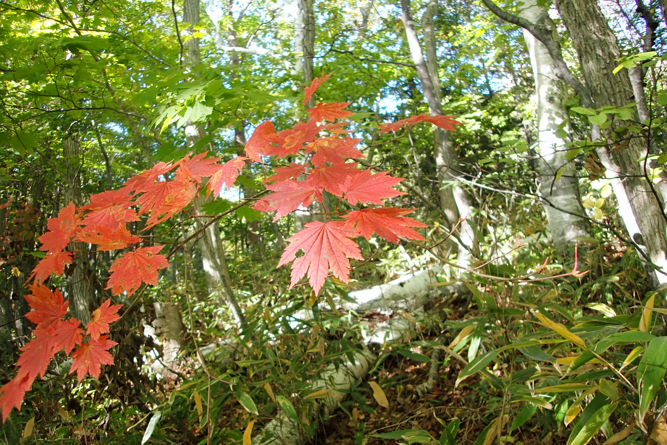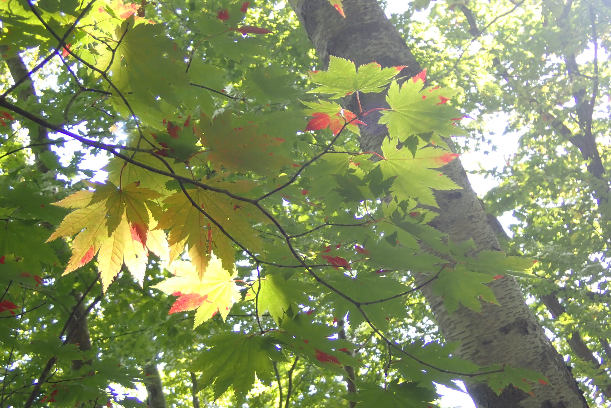 森の中はまだ緑が多いものの、赤、オレンジ、黄色、茶色などの落ち葉や紅葉した葉の色合いが見られます。