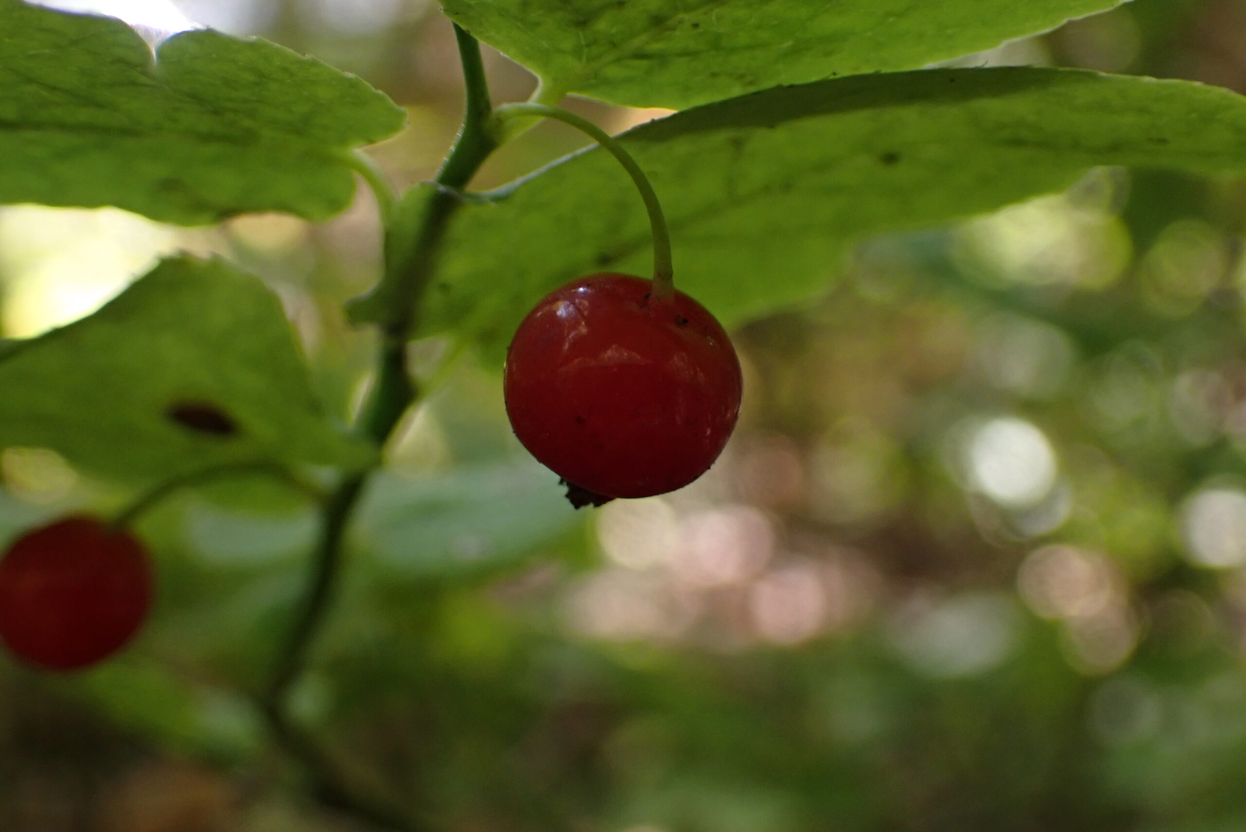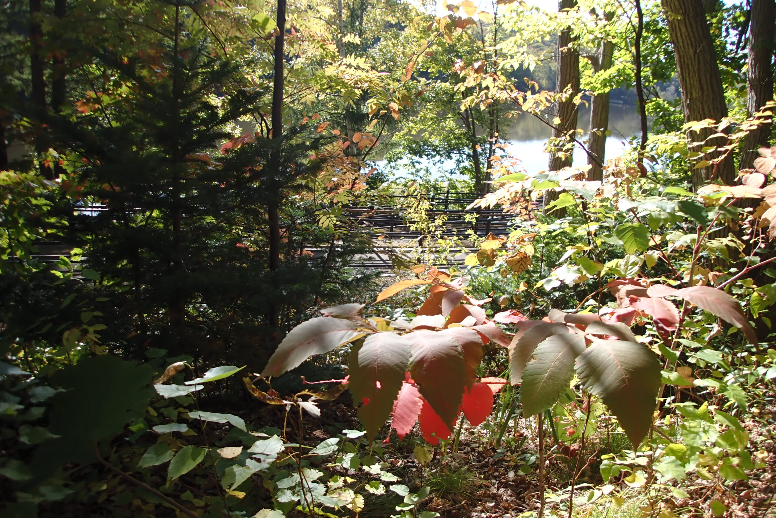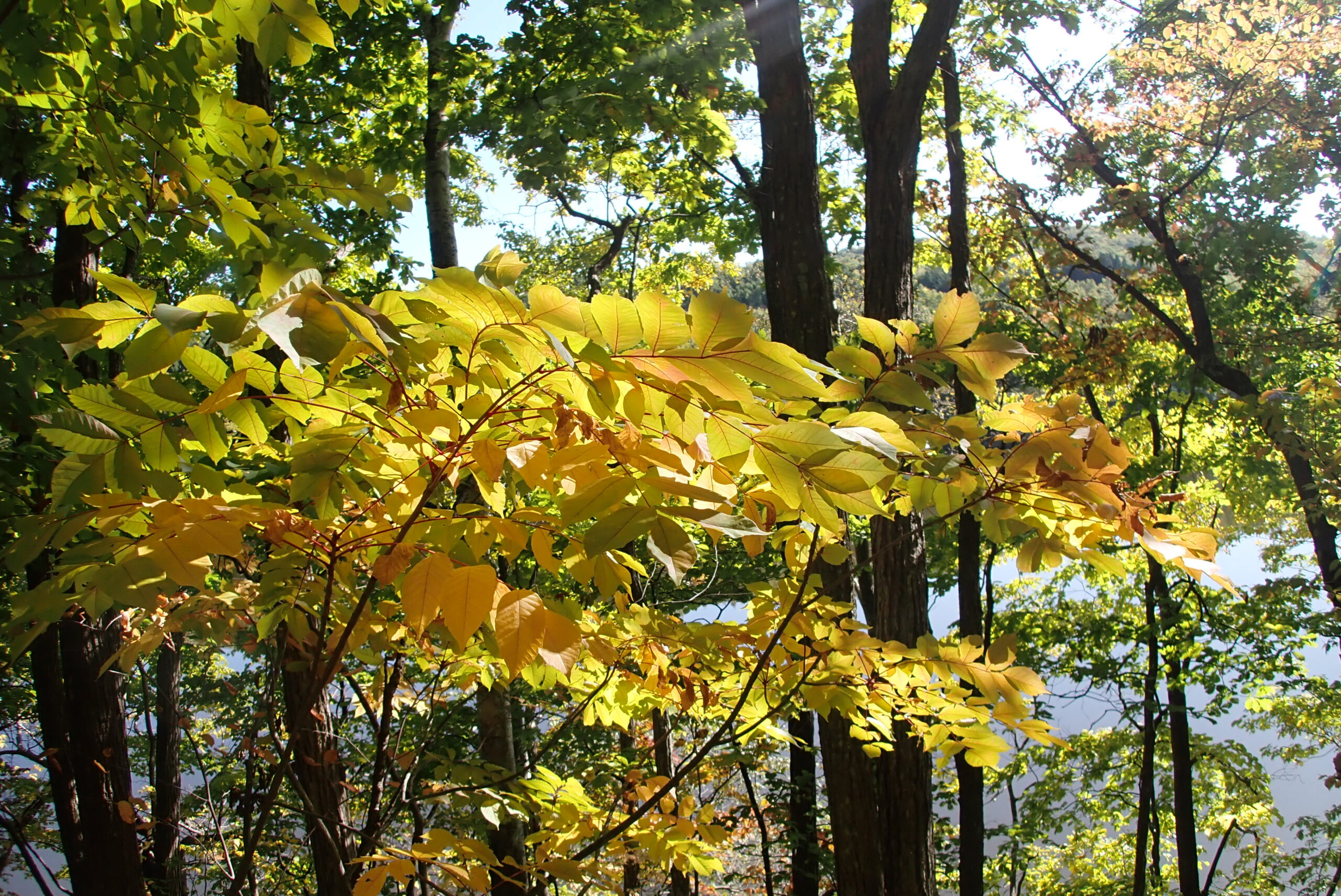 森の中はまだ緑が多いものの、赤、オレンジ、黄色、茶色などの落ち葉や紅葉した葉の色合いが見られます。