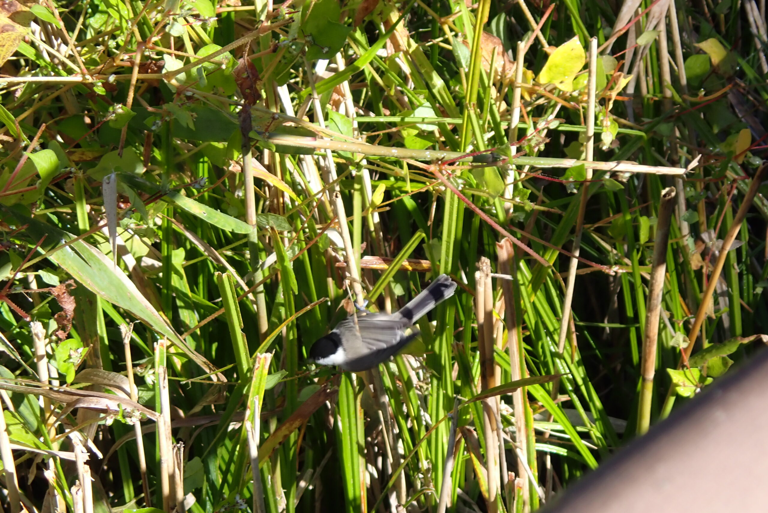 ハシブトガラが木道の両脇に生えているミゾソバの果実をついばんでます。