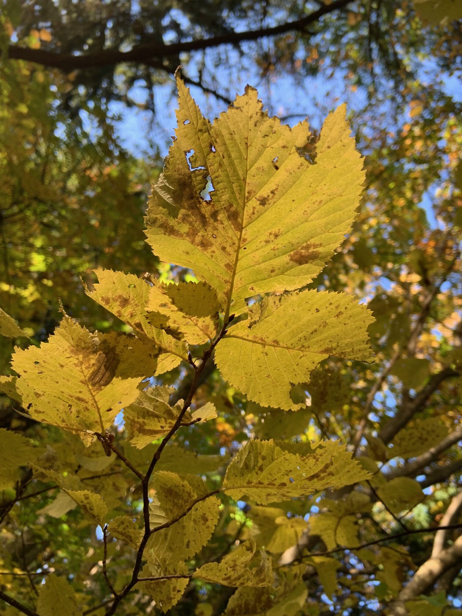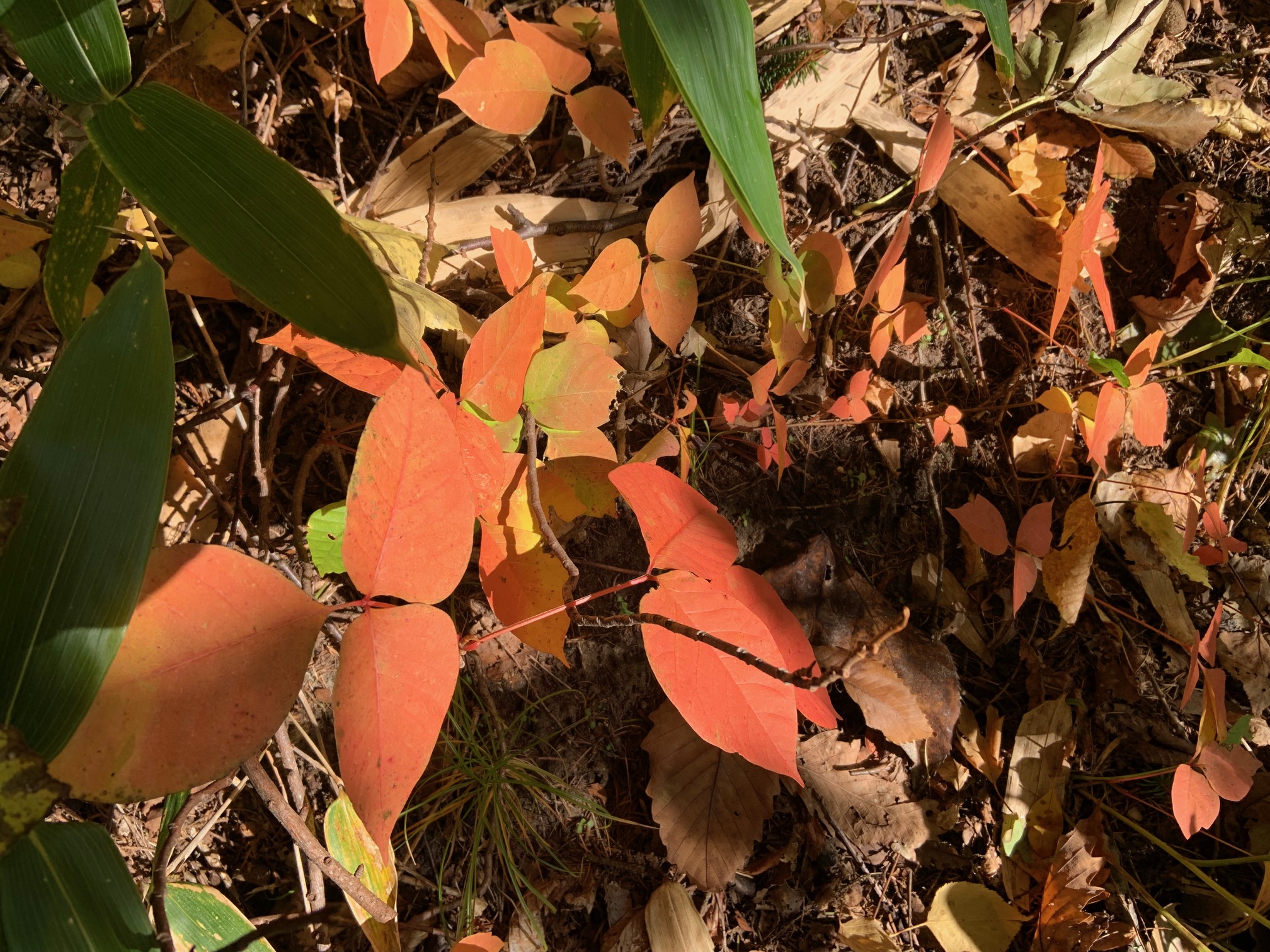 樹々の紅葉の色合いの違い、太陽光の強さの加減、風に揺れる影、舞い落ちる落ち葉が織りなす美しさはこの季節限定の贅沢です。