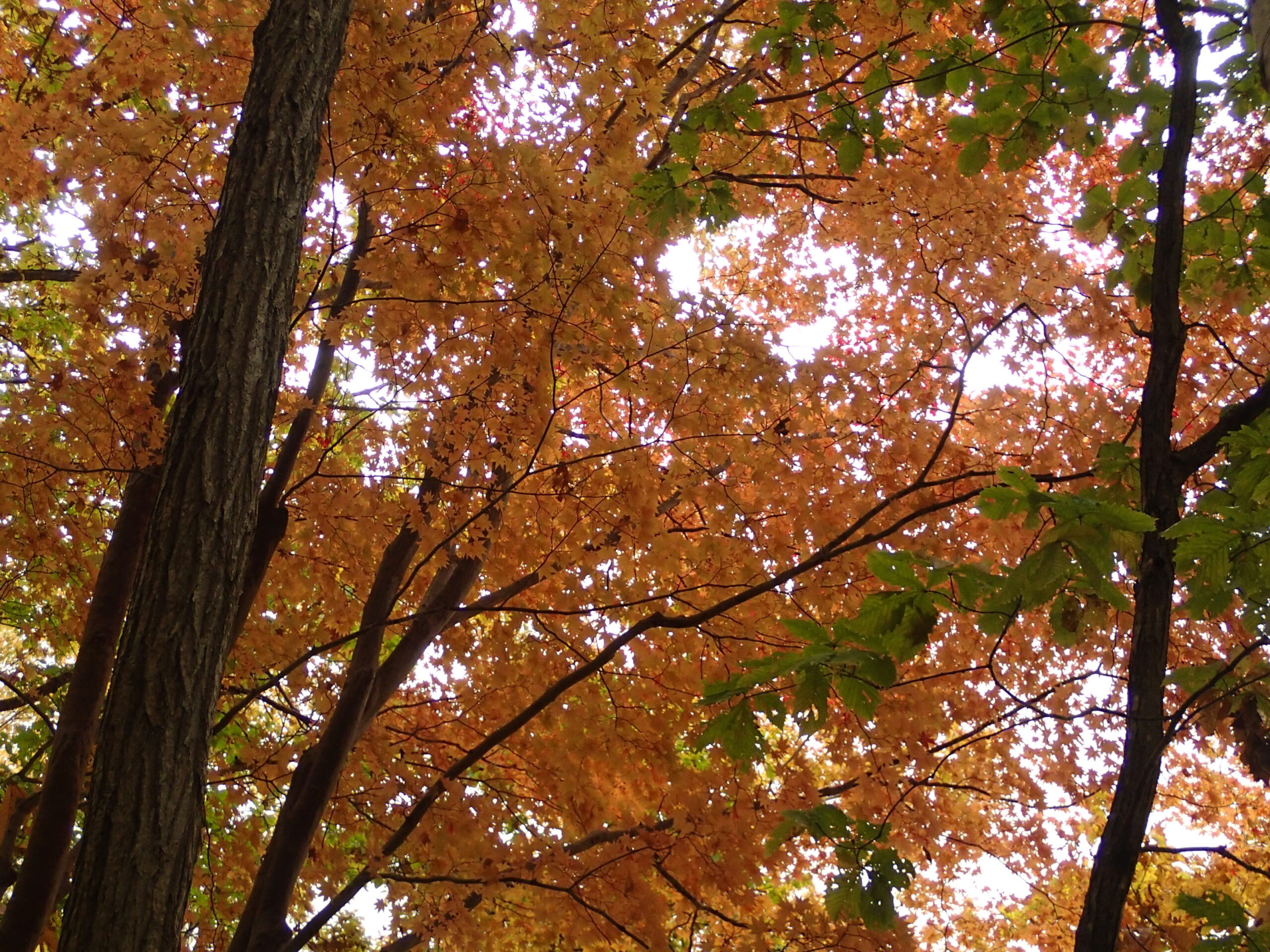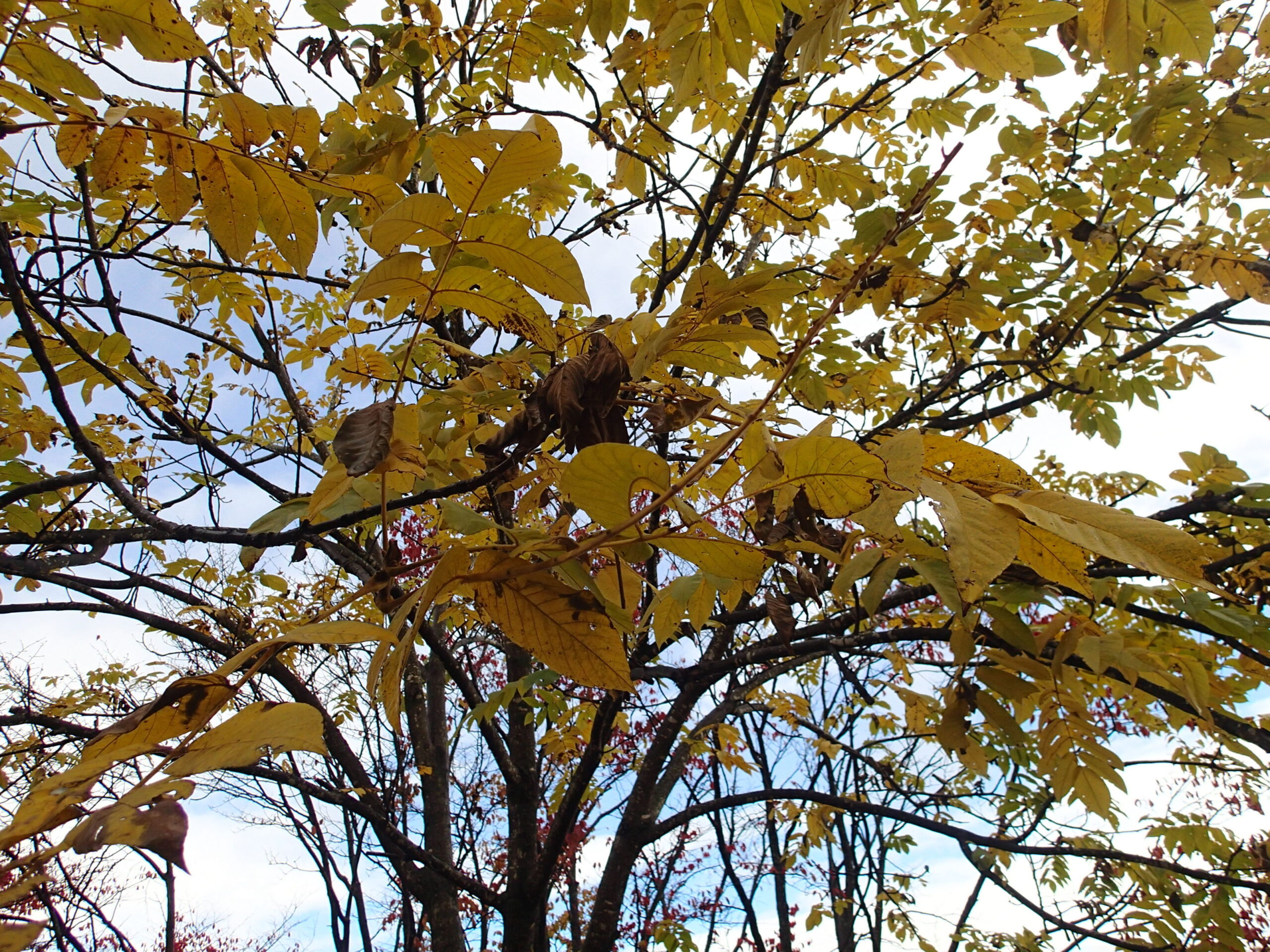 ハウチワカエデがモザイク状に紅葉しています。