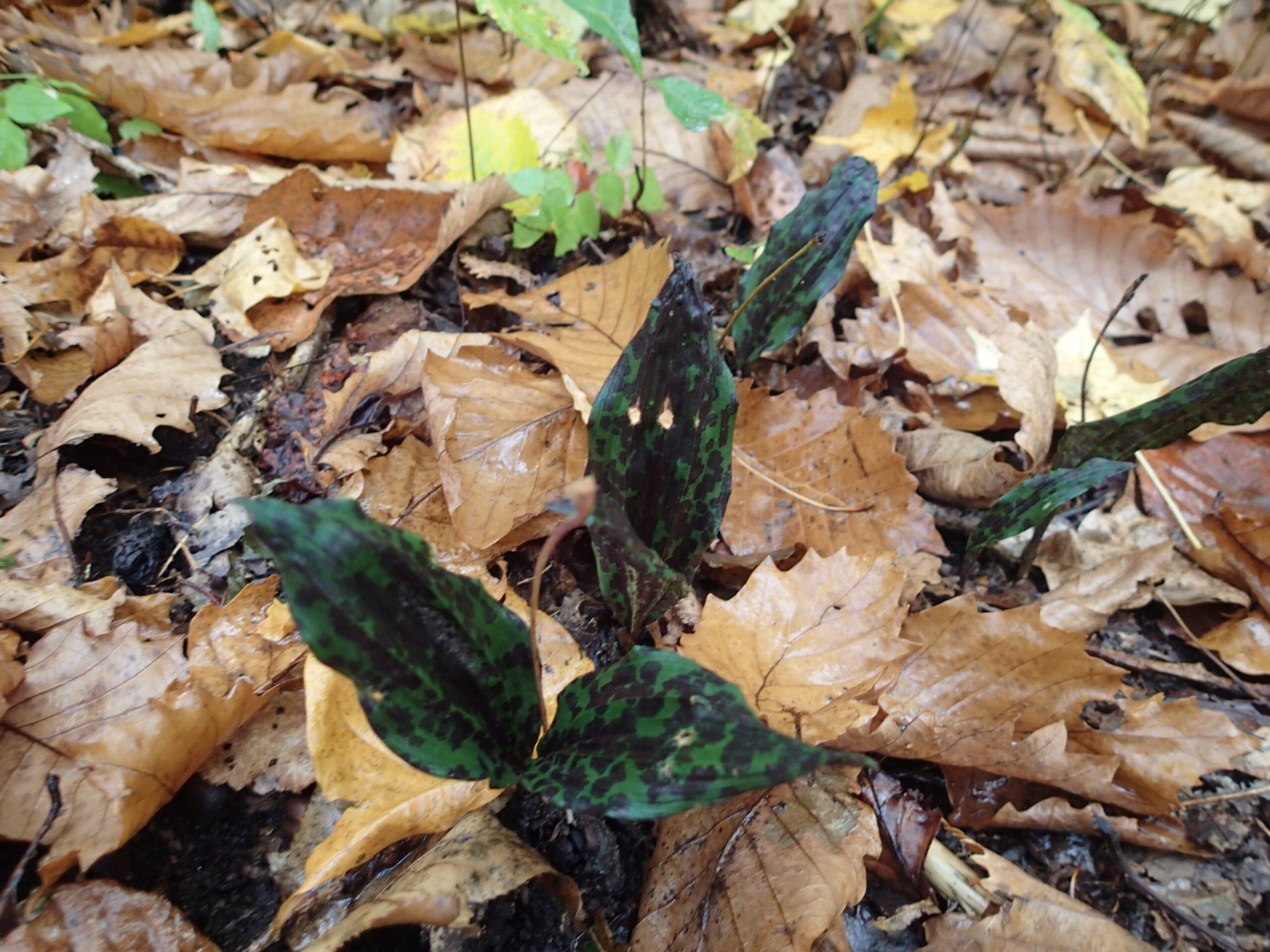 夏の間休眠していたトケンランの葉が落ち葉の間から顔を出していますよ。