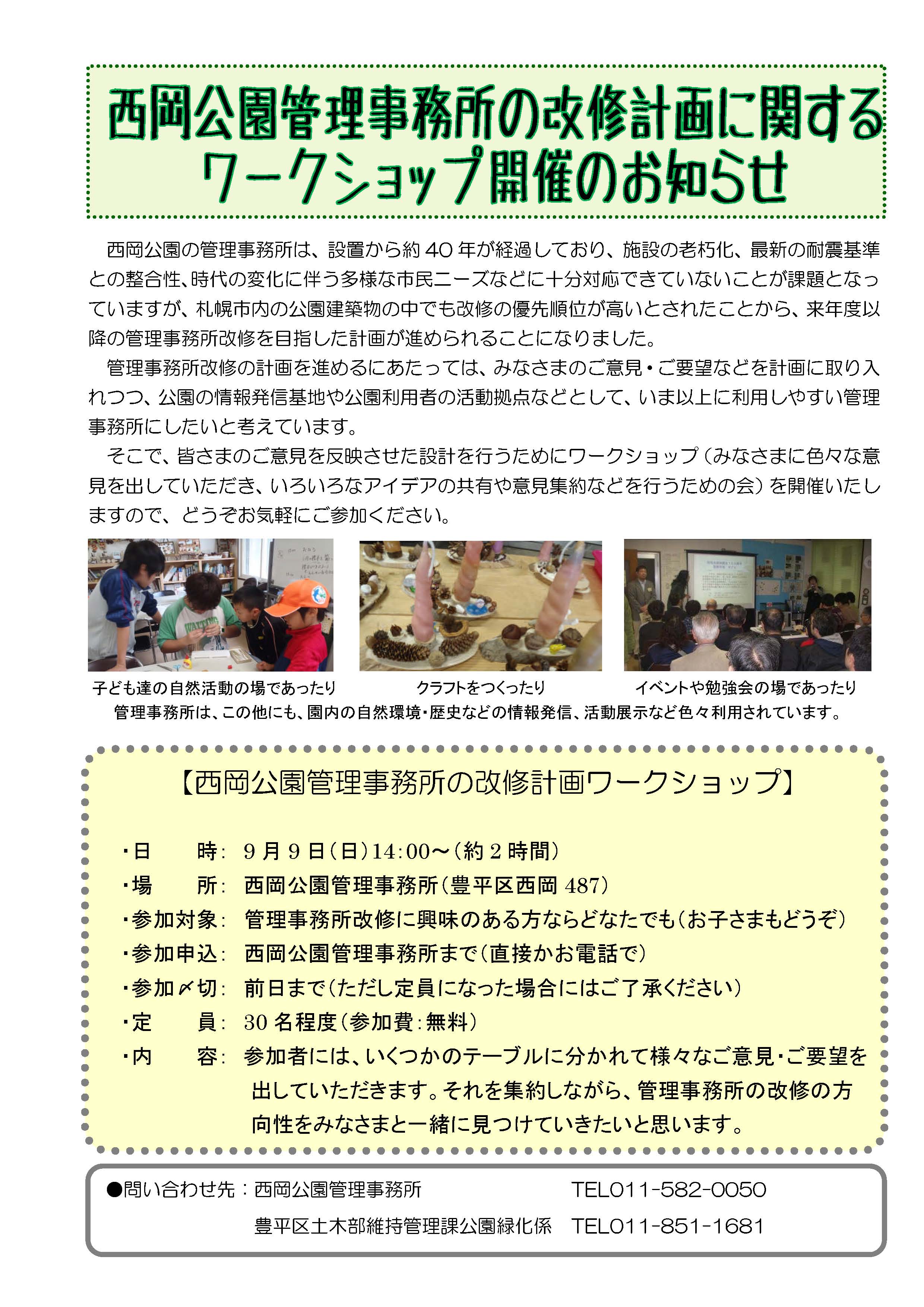 西岡公園管理事務所の建て替えに関するワークショップを開催します。
